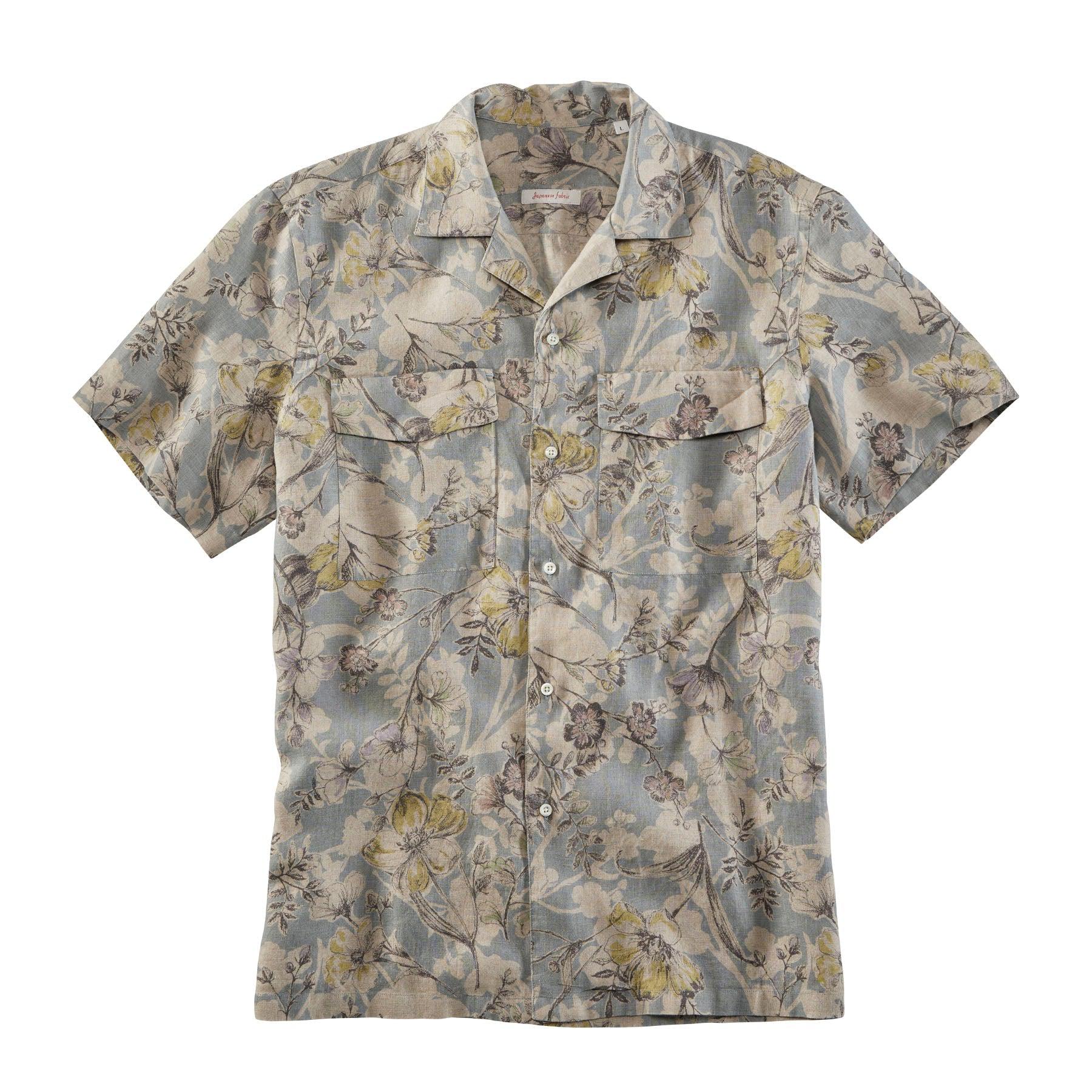 Kurzarmhemd aus japanischem Leinen von A.B.C.L. Diese sehr spezielle Qualität ist etwas leichter und nicht so knitteranfällig, hat aber genauso die lässige Optik und den leicht kühlenden Effekt. Der All-Over-Print ist zwar durch das florale Motiv sehr fröhlich aber Dank der Farbwahl nicht zu aufdringlich. Komplett handgemacht in Italien.