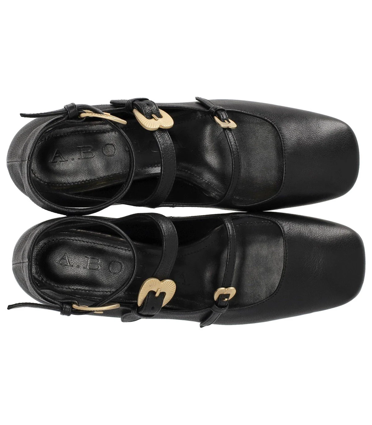 Ballet flat by A.Bocca made of black hammered leather, characterized by a slightly squared toe and adjustable straps with a golden heart-shaped buckle. Leather lining and insole, leather sole. Heel height 2.5 cm.