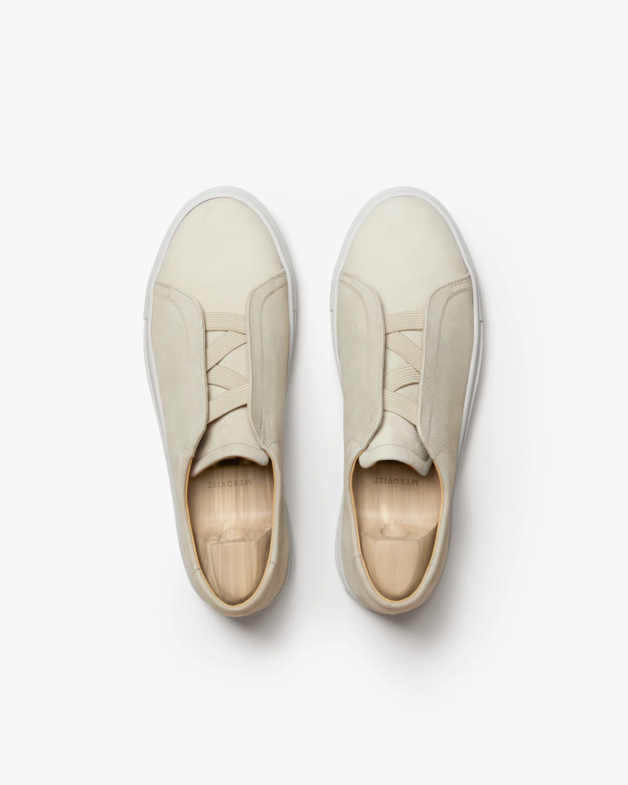 Alnö in beige nubuck offers a fresh interpretation of minimalist footwear, shaped by Scandinavian design principles and a focus on comfort. The matte finish of the tumbled nubuck leather gives a soft, understated texture, while the pale beige tone brings a sense of quiet refinement. Signature M-shaped elastic panels cross the instep, blending visual interest with effortless slip-on functionality.