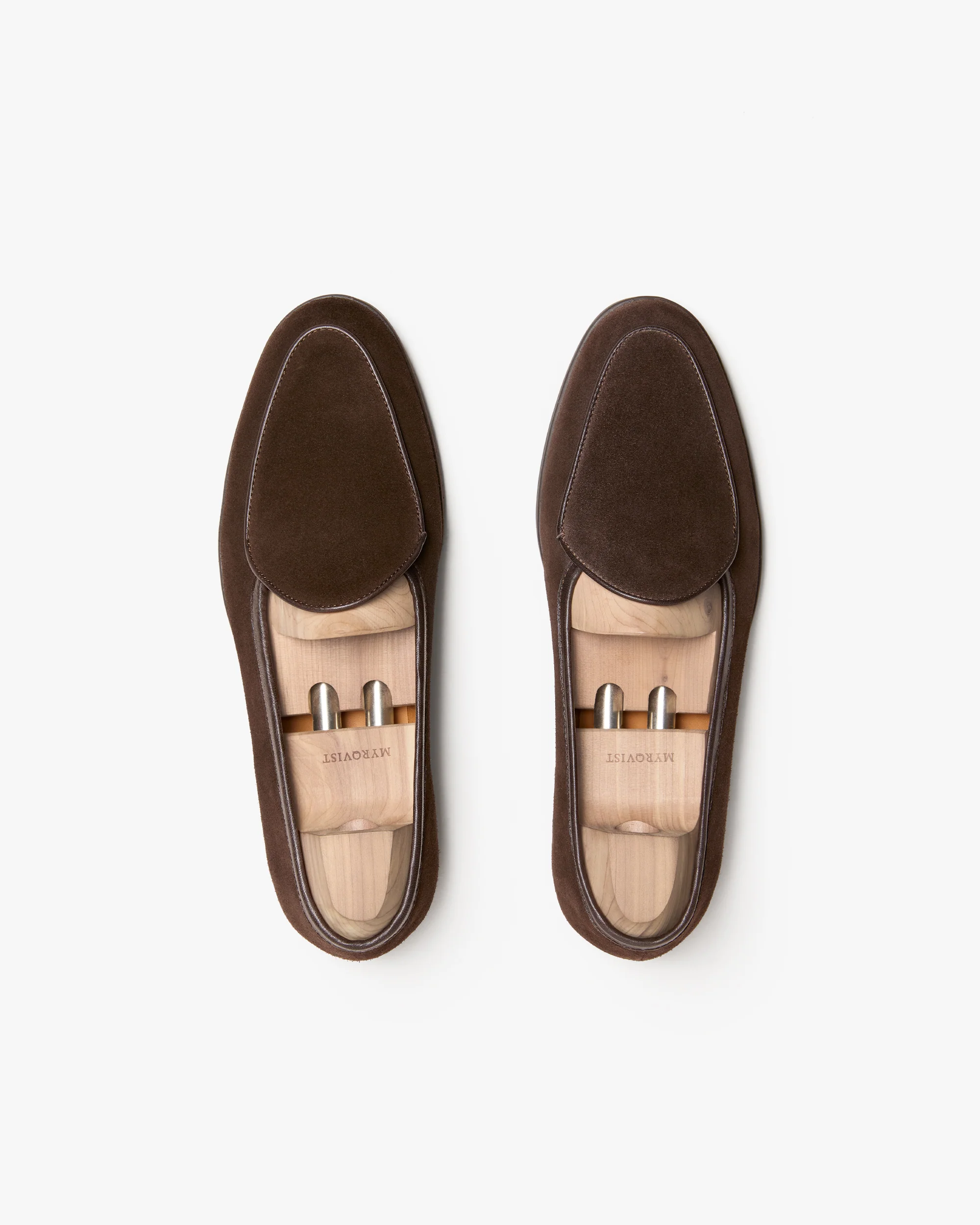 Ängby Walker in dark brown suede transitions seamlessly from tailored wool trousers to relaxed denim, making it a versatile addition to any wardrobe. The deep brown tone pairs effortlessly with a range of colours and textures, from business casual slacks to weekend attire. This is a loafer for those who appreciate high quality suede loafers that blend classic style with contemporary practicality.