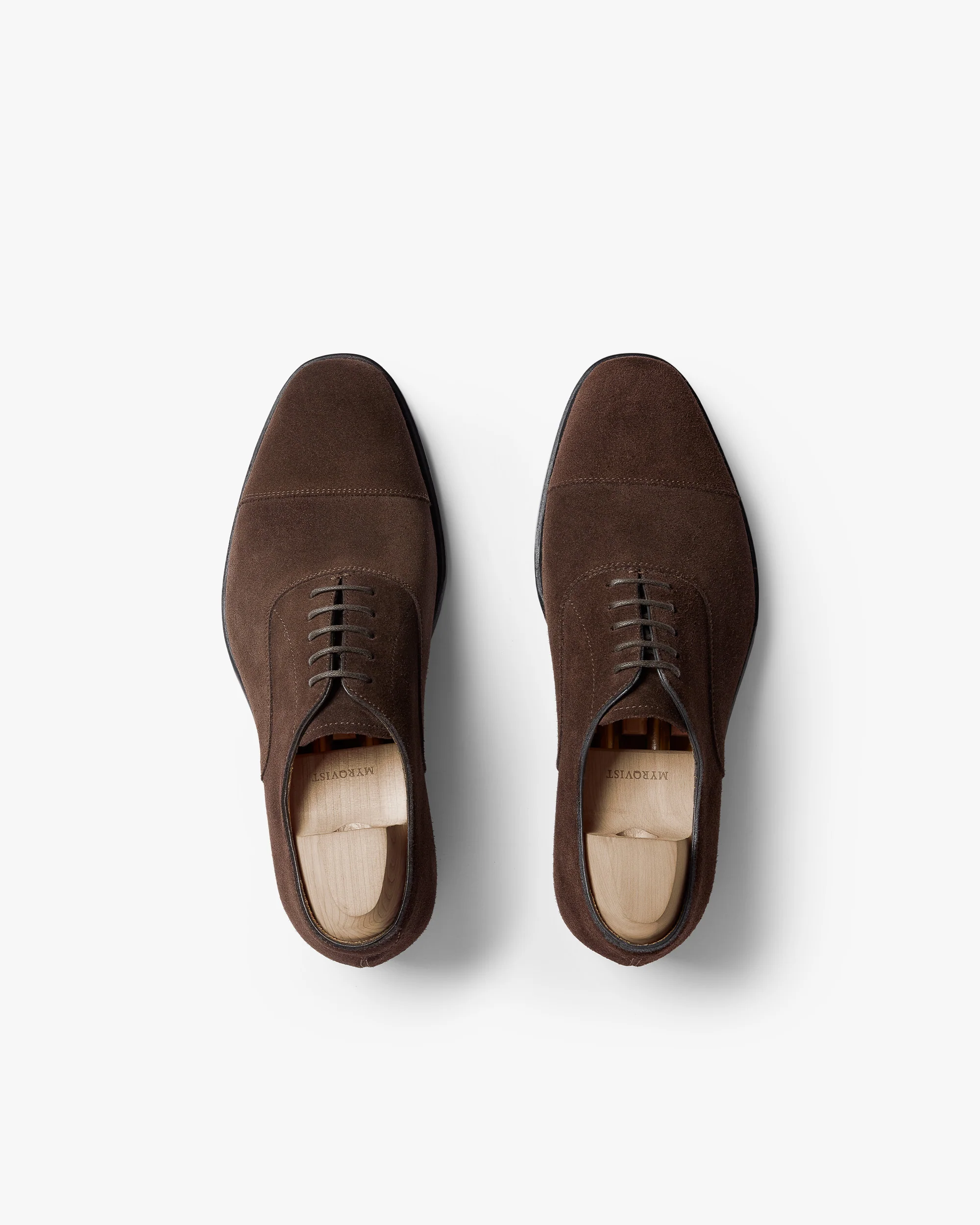 Äppelviken II in dark brown suede offers a fresh take on the classic cap-toe Oxford, blending traditional elegance with a soft, tactile quality. The rich dark brown suede gives this formal silhouette a nuanced feel, suitable for a range of discerning sartorial choices. It is shaped on Last #6, providing a standard width that accommodates most feet and features a subtly chiseled toe for a refined profile.
