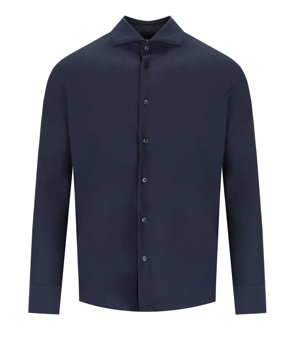 Archivium shirt made of stretch technical fabric in dark blue tones. Featuring a button closure, it has long sleeves with buttoned cuffs and a classic collar. NO IRON fabric, regular fit. Composition: 76% polyamide, 24% elastane.