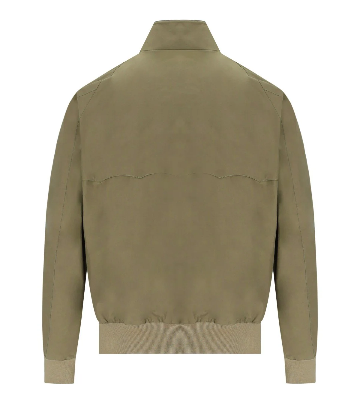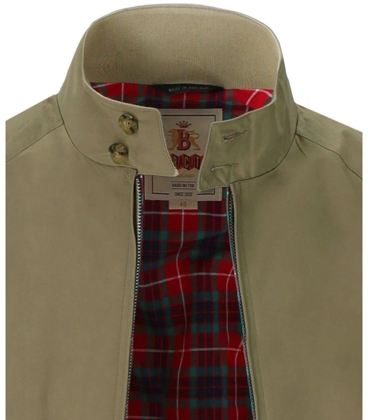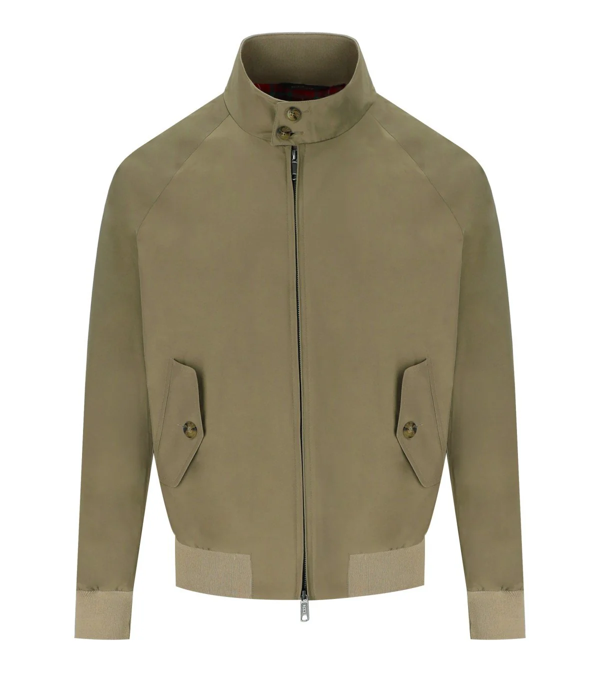 Beige cotton blend G9 bomber jacket by Baracuta. Featuring a front zip closure, it has a ribbed high collar with double button. Internally lined in red tartan pattern, it has long raglan sleeves and front buttoned pockets. Cuffs and hem in stretch fabric finished with ribbed work. Slim fit.