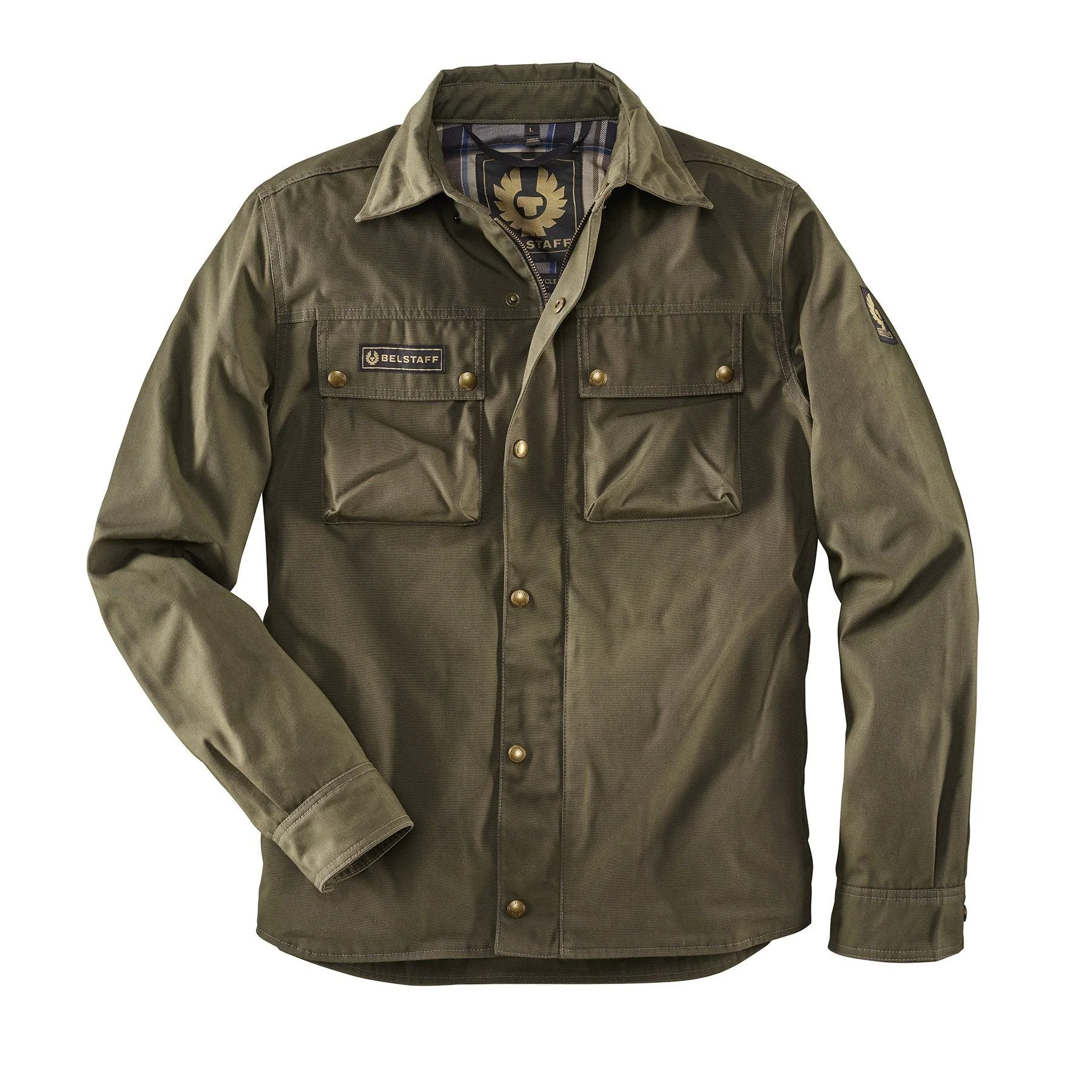 Overshirt aus Baumwollmix mit CE Zertifikat von Belstaff Pure Motorcycle. Klassisch geschnitten mit Umlegekragen, der durch Druckknöpfe vor lästigem Flattern beim Fahren gesichert ist. Am Vorderteil sind die typischen Brusttaschen mit Patte sowie zwei in der Seitennaht versteckte Taschen mit Reissverschluss. Eine zusätzliche Innentasche bietet weiteren Stauraum. Der Zipp im Vorderteil endet ca. 14cm vor dem Bund, sodass die Jacke beim Fahren perfekt sitzt. Die zusätzlichen Druckknöpfe unterstreichen den Stil einer Hemdjacke. Protektoren für Schultern und Ellbogen sind im Lieferumfang wie immer enthalten und können bei Bedarf leicht herausgenommen werden. Die Tasche für einen zusätzlichen Rückenprotektor ist bereits eingearbeitet. Das klassische Belstaff Futter aus Baumwolle sorgt für das perfekte Tragegefühl.