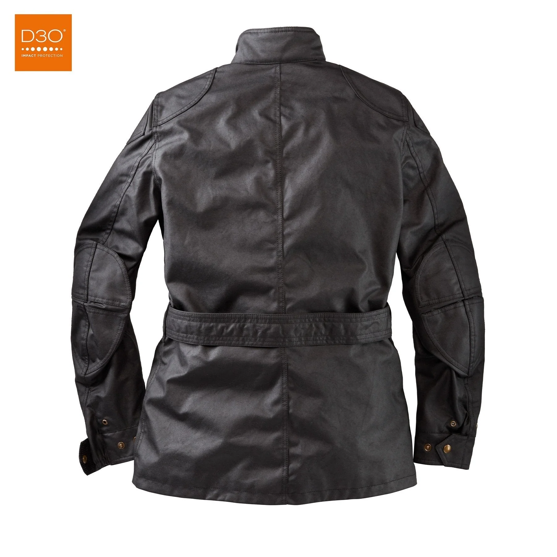 Endlich auch für Damen: Die verbesserte, CE-zertifizierte Motorrad-Version der Scrambler- oder Enduro-Jacke Trialmaster Pro in typischer Belstaff Pure Motorcycle Optik. Die schwarze gewachste 10oz Signature Baumwolle von British Millerain wurde mit abriebfestem Cordura® 500 in den sturzgefährdeten Zonen verstärkt. Unter der gewachsten Baumwolle wurde ein wasserdichtes und atmungsaktives MIPOREX® Membran eingearbeitet, die Nähte wurden alle versiegelt. Im authentischen Belstaff Stil mit verstellbarem Halsriemen, Gürtel mit Messing-Schnalle, die zum Schutz des Motorrads mit einer Lasche verdeckt ist und vier aufgesetzte Taschen mit Sturmklappen und Messing-Druckknöpfen. Praktisch für jedes Wetter und Jahreszeit ist das herausnehmbare, wärmende aber dünne Steppfutter mit einer Micro-Valtherm-Wattierung. Herausnehmbare, CE-zertifizierte D3O® Protektoren an Schultern und Ellbogen werden ebenfalls mitgeliefert, eine Tasche für den D3O® Rückenprotektor ist bereits eingearbeitet. Unter den Armen sind metallverstärkte Belüftungsschlitze eingearbeitet. Typisch ist das kleine Union Jack Label auf der linken Brusttasche sowie das Belstaff Logo auf dem linken Ärmel. Die perfekte Motorradjacke für lange Touren im Stil der 60er Jahre mit der Funktion unserer Zeit.