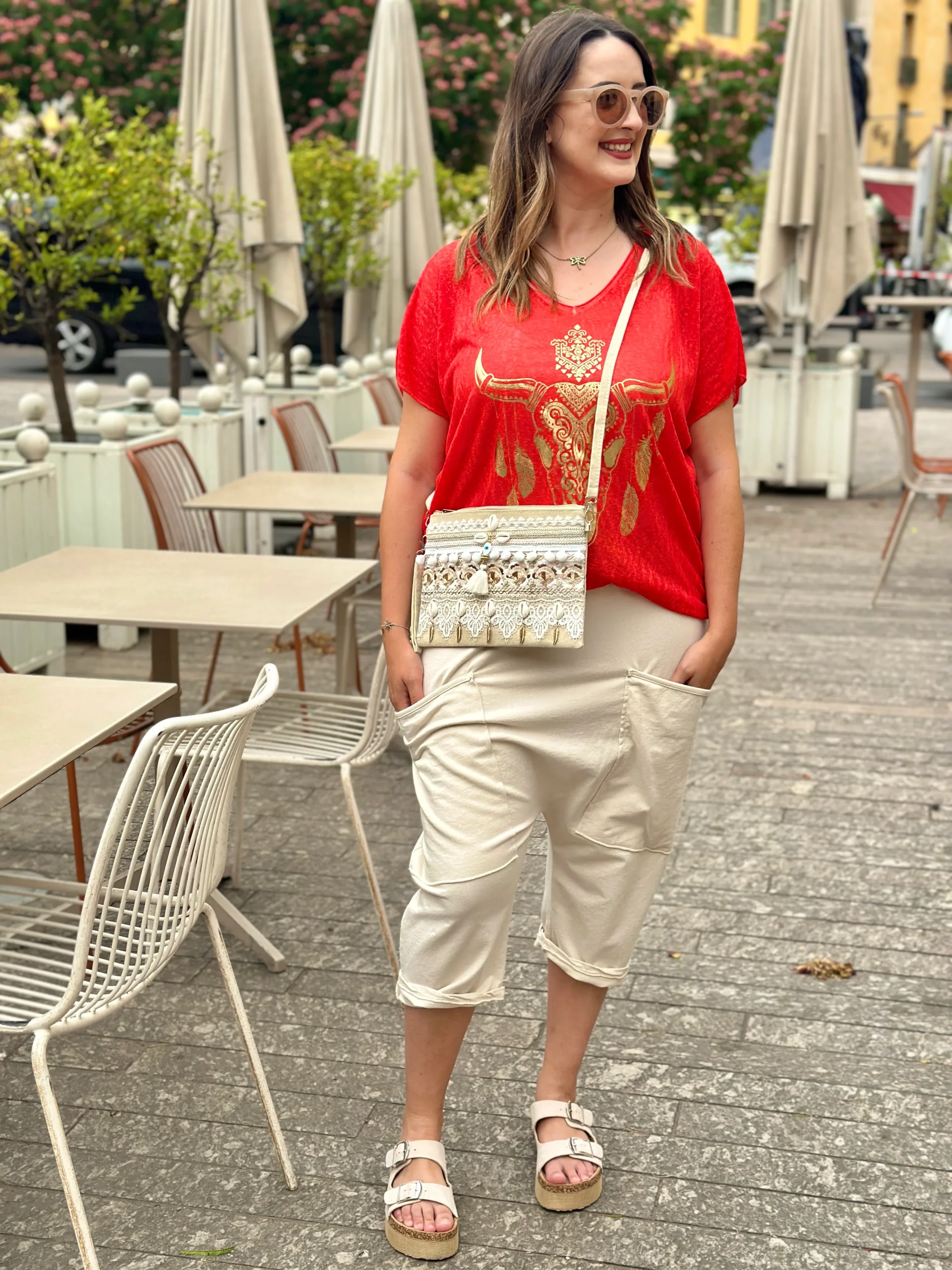 𝐃𝐄𝐒𝐂𝐑𝐈𝐏𝐓𝐈𝐎𝐍 . Sarouel bermuda, avec poches plaquées sur le devant. Élastique à la taille 𝐃𝐈𝐌𝐄𝐍𝐒𝐈𝐎𝐍𝐒 . TAILLE UNIQUE, convient d’un 36 à un 44 . Longueur 76cm ; Entrejambe 47cm Le mannequin mesure 1m70 𝐂𝐎𝐌𝐏𝐎𝐒𝐈𝐓𝐈𝐎𝐍 . 95% coton . 5% élasthanne . Lavage 30 degré