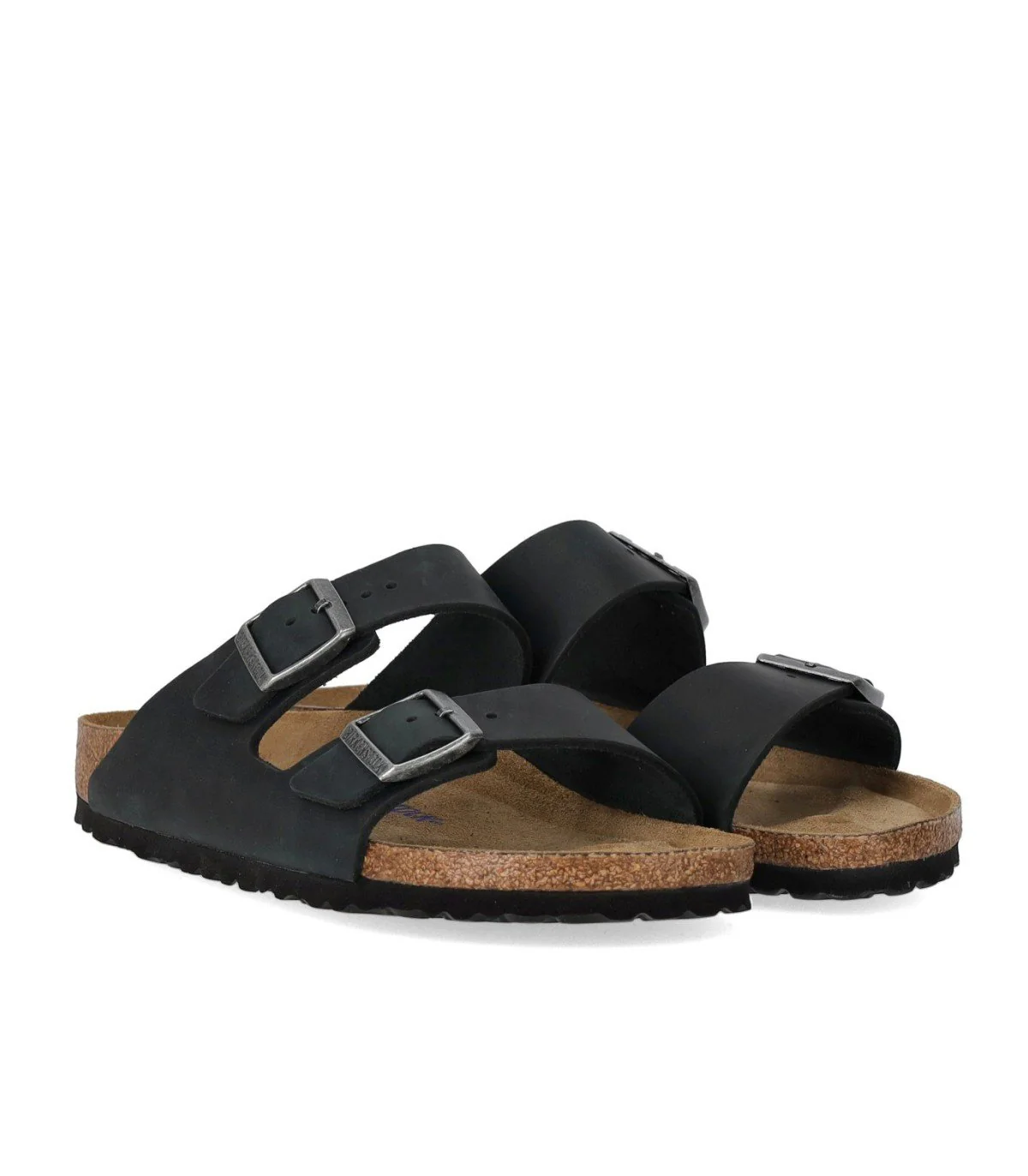 Arizona sandals by Birkenstock made of oiled nubuck leather in black. Characterized by an open seam construction, it features a suede footbed, natural cork insole, and EVA rubber sole. Finished with adjustable metal buckle straps. Sole height 1 cm. Narrow fit.