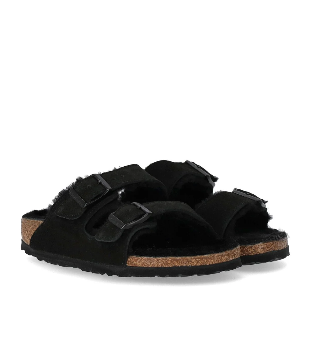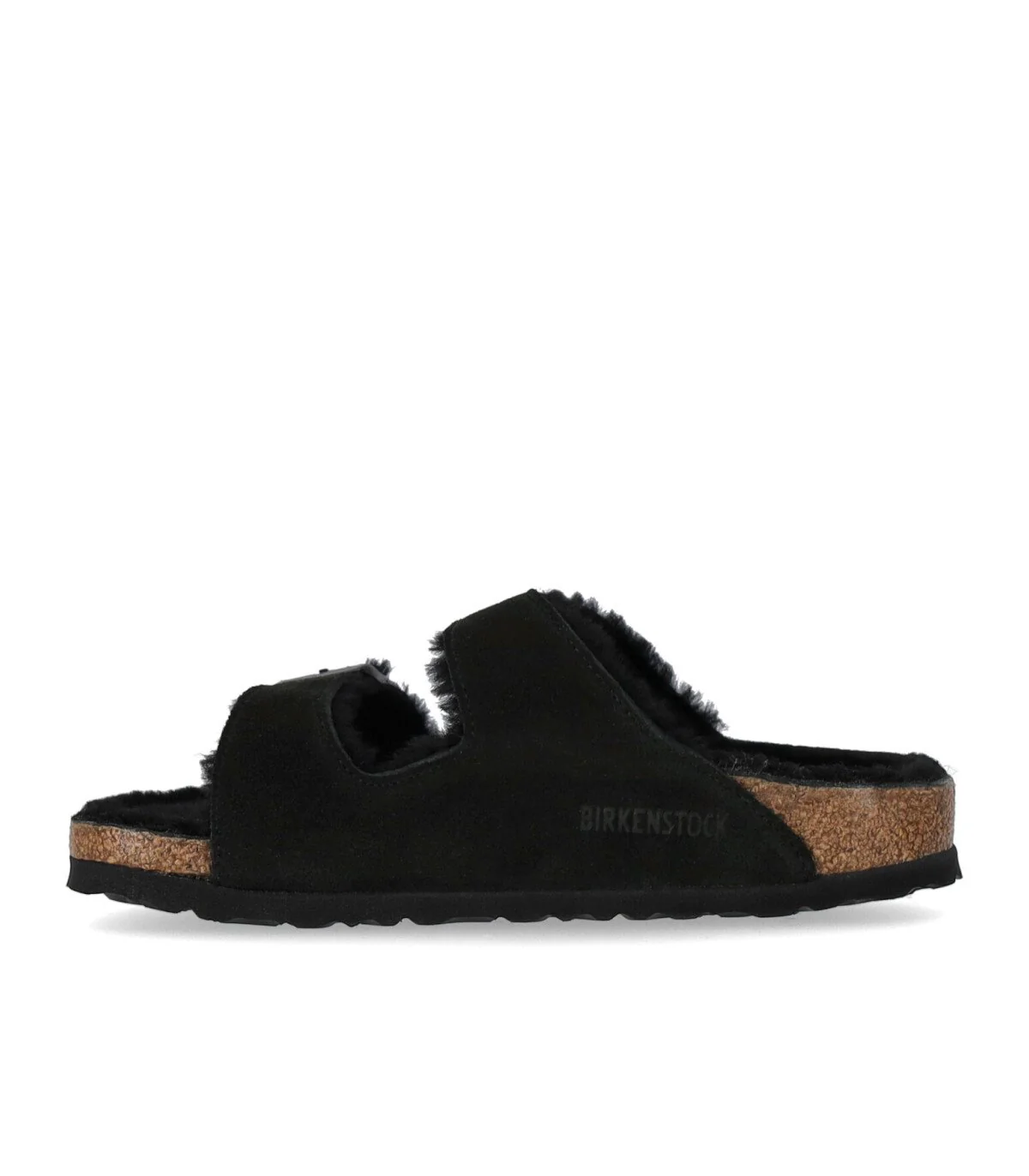 Arizona Shearling sandal by Birkenstock made of black suede with shearling lining. Color matched buckles, natural cork insole and rubber sole, height 3,5 cm. Narrow fit.