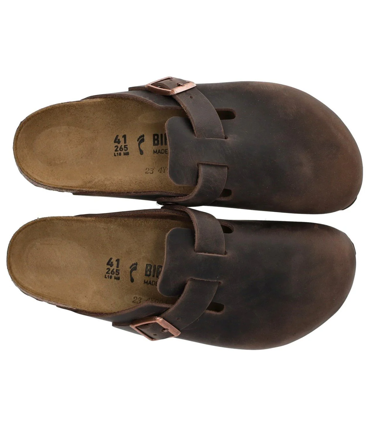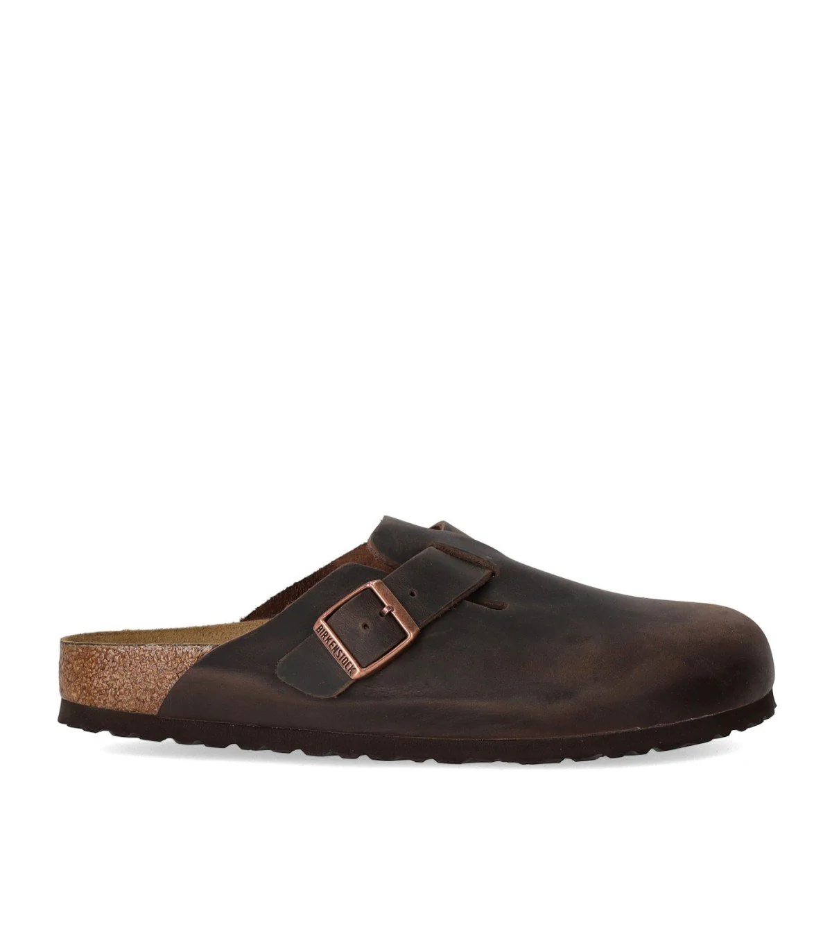 Birkenstock Boston clogs made of oiled nubuck leather in dark brown tones. Characterized by a suede leather insole, it features a natural cork and latex footbed. Finished with an adjustable metal logo strap. EVA rubber sole. Height 1 cm. Narrow fit.