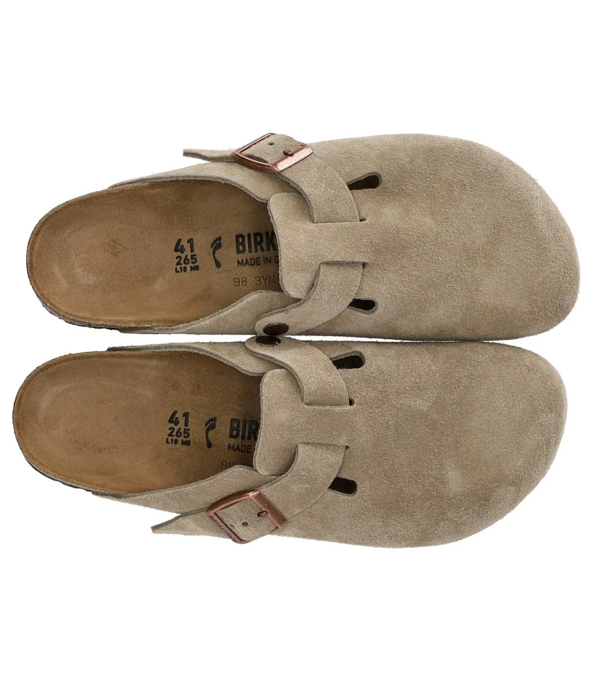 Boston clog by Birkenstock made of soft taupe suede, with adjustable strap and logoed buckle on the side. Soft suede insole, cork footbed and rubber sole. 1 cm heel height.