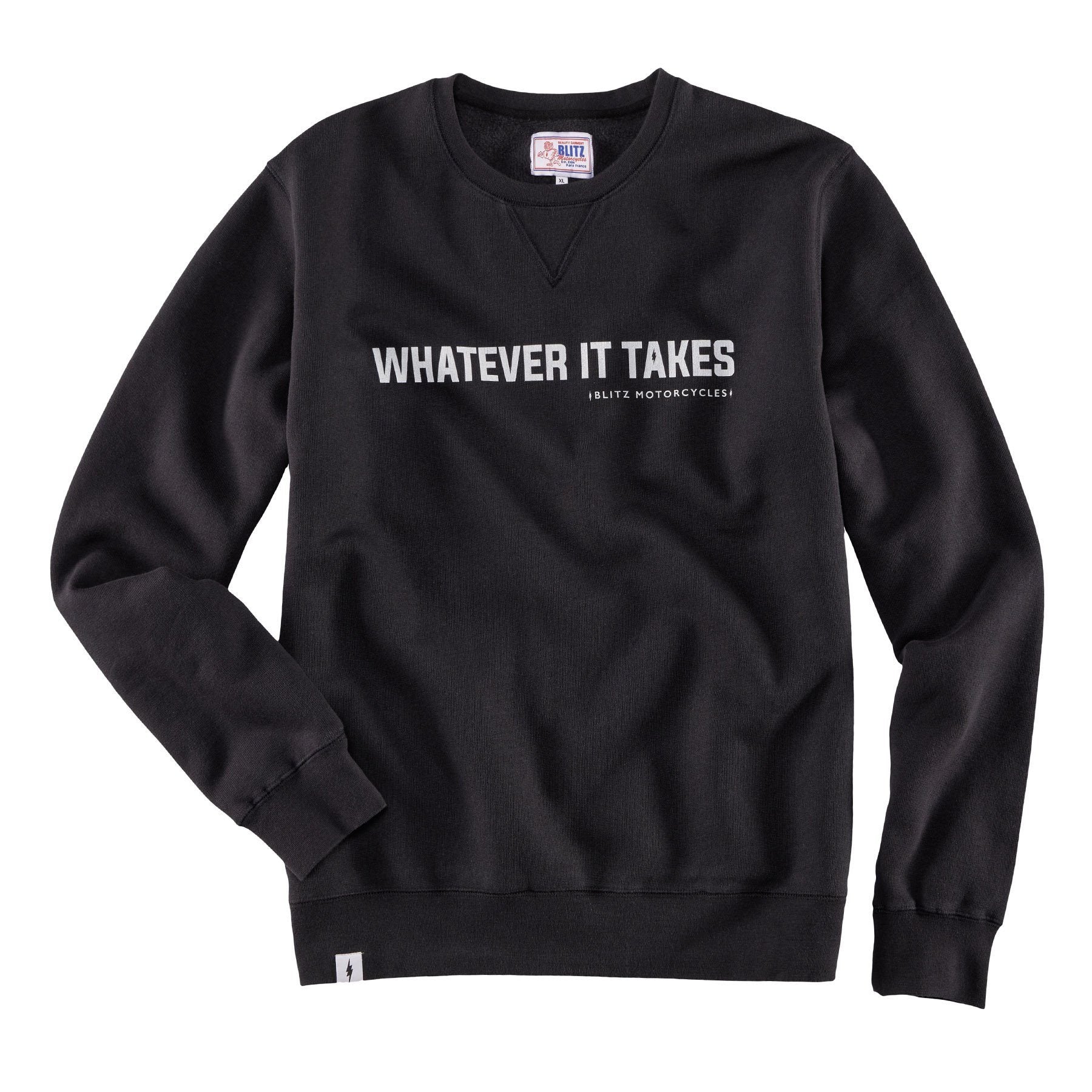 Herrensweater aus der exklusiven Kollektion von Blitz Motorcycles. Der Print am Vorderteil kann durchaus als Lebensmotto interpretiert werden. Die Ärmel und der Bund sind mit den klassischen Strickbündchen ausgestattet.