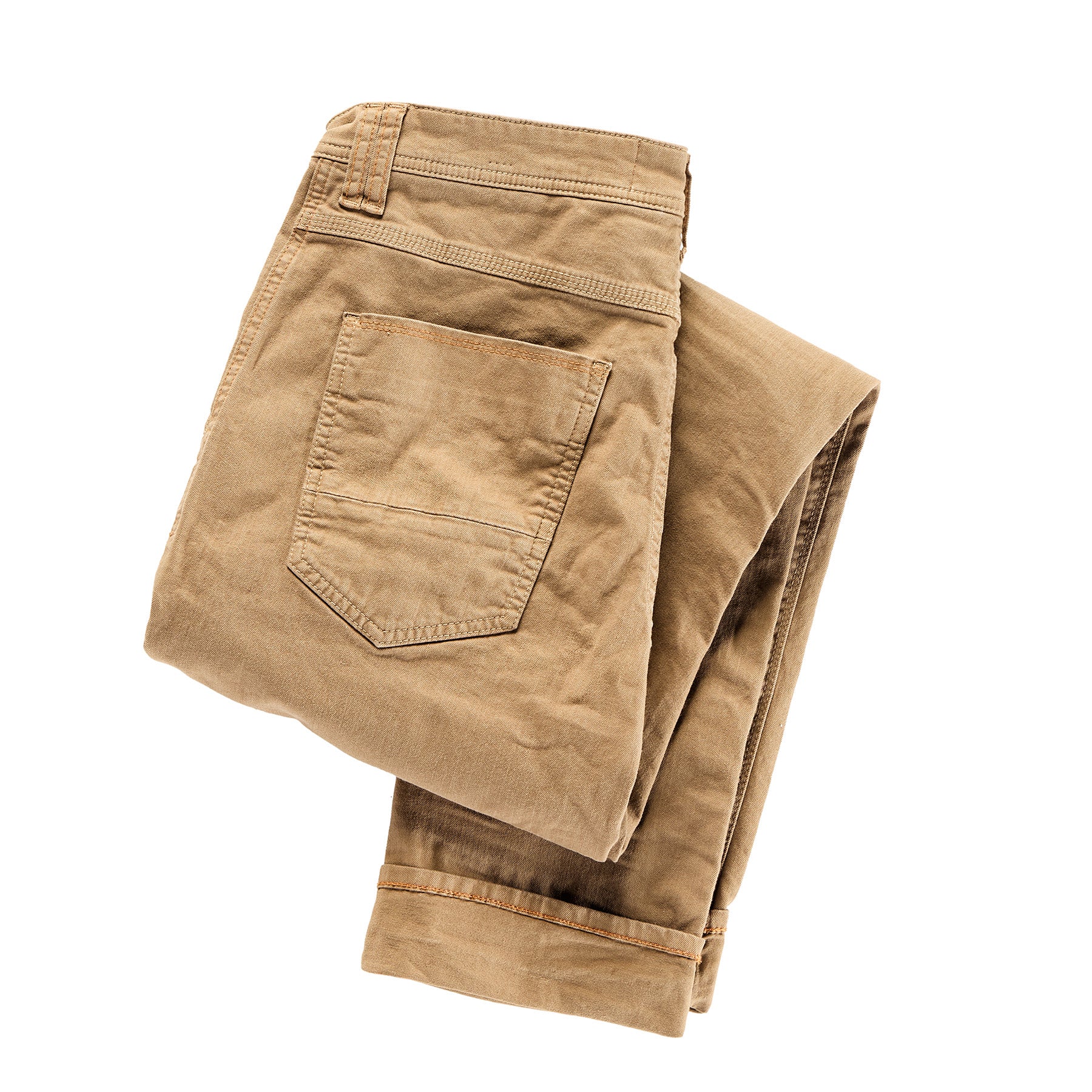 Klassische Chino von Blue de Gênes. Durch den relativ geraden Schnitt und die dezenten Schubtaschen bekommt die Hose einen sehr schlichten Look, der durch den dunklen Karamellton perfekt betont wird. Die Liebe zum Detail sowie die aufwendige Handarbeit erkennt man erst auf den zweiten Blick, wie z.B. die verstärkten Gesäßtaschen, die doppelten Gürtelschlaufen oder die gehämmerten Messingknöpfe. Länge immer 34 Inch.