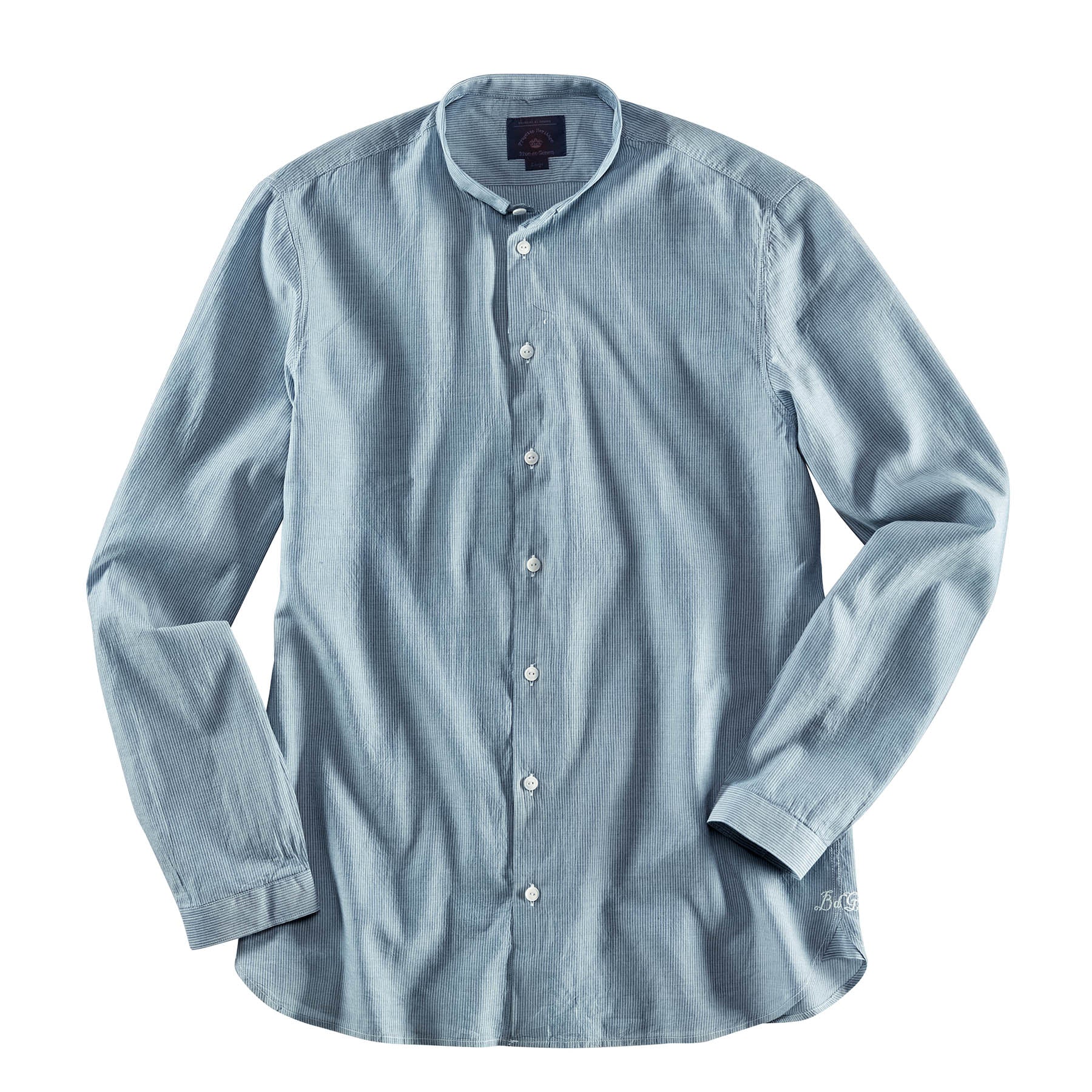 Herrenhemd in lässigem Workerstyle von Blue de Gênes. Nicht nur das Design, das zarte Streifenmuster in Blau, auch der hochgeschlossene, sehr schmale Kragen und die Manschetten erinnern an die 30er Jahre des letzten Jahrhunderts. Ein kleiner schnörkeliger Stick an der linken Seite rundet das Bild sehr schön ab. Die etwas dünnere Baumwolle macht das Hemd angenehm leicht und luftig.