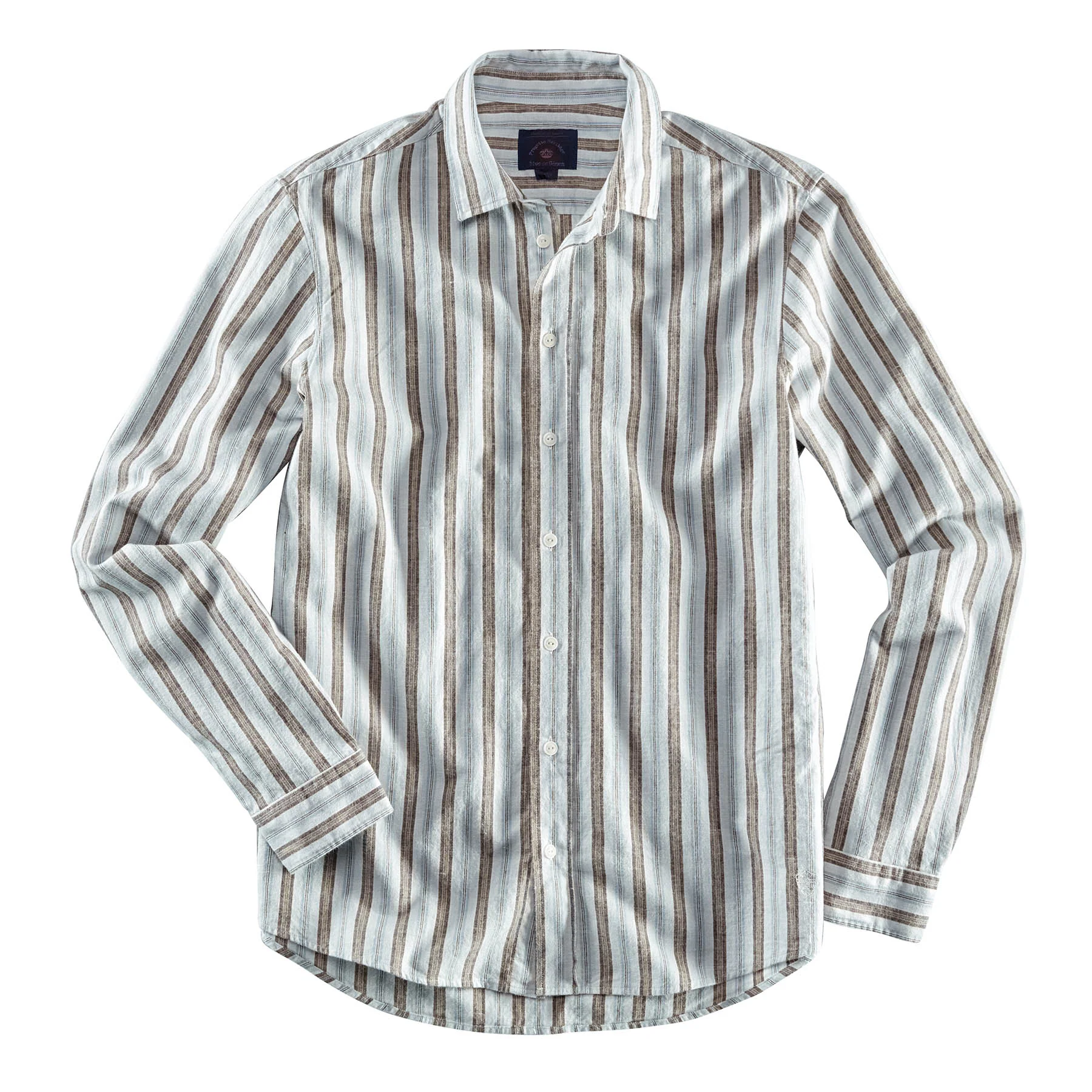 Herrenhemd in Baumwolle/Leinen Mischung von Blue de Gênes. Durch die Kombination dieser zwei Materialien werden die besten Eigenschaften vereint: leicht kühlend, nicht allzu knitteranfällig, angenehm weich und nicht zu dünn. Durch die leicht verwaschene Optik wird das Streifendesign lässiger und nicht zu spießig aber immer auch gepflegt. Echte Steinnußknöpfe unterstreichen die Wertigkeit des Hemdes.