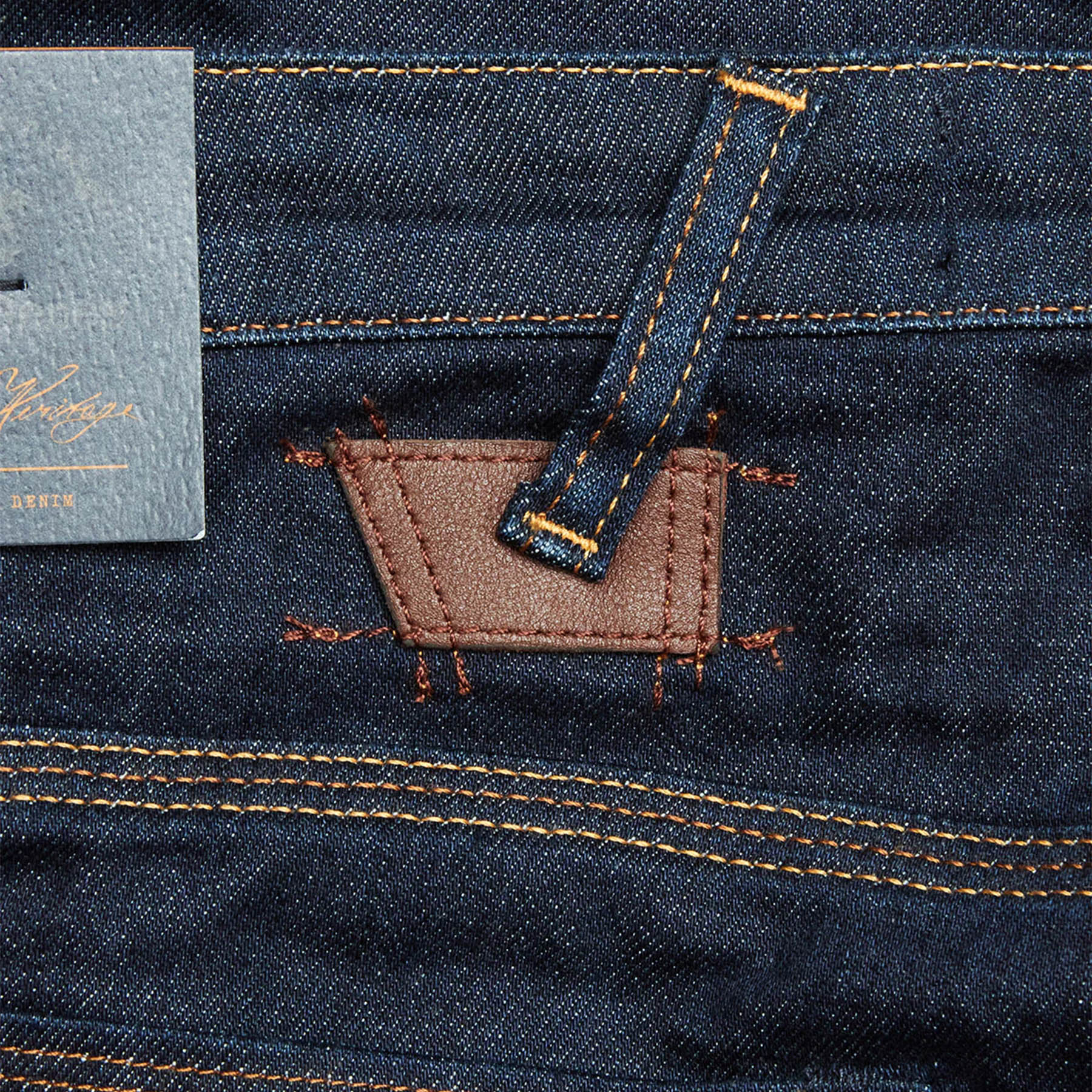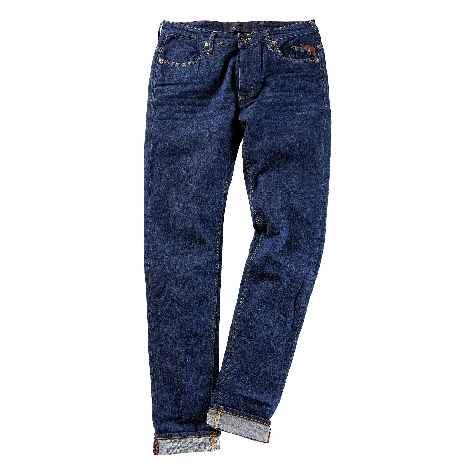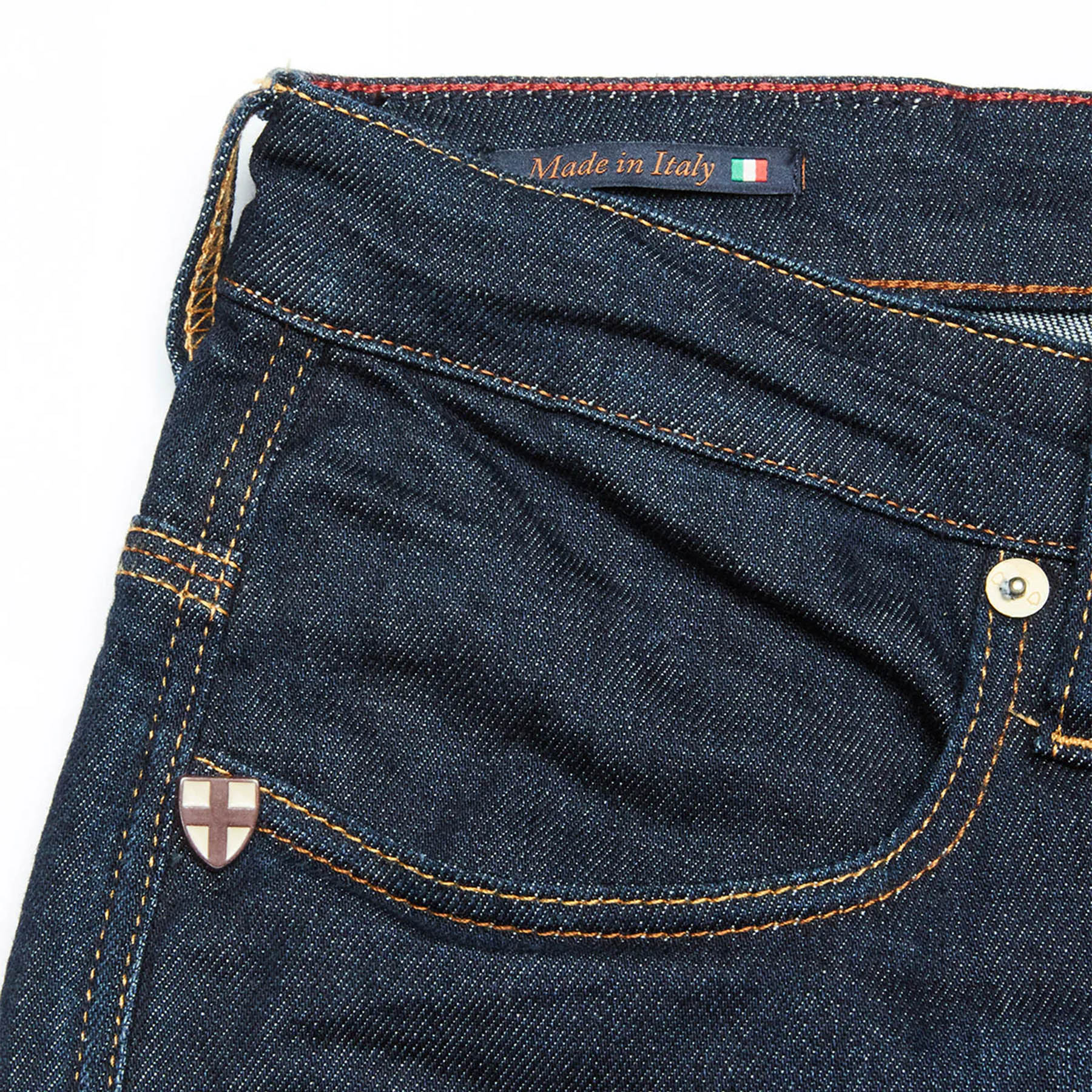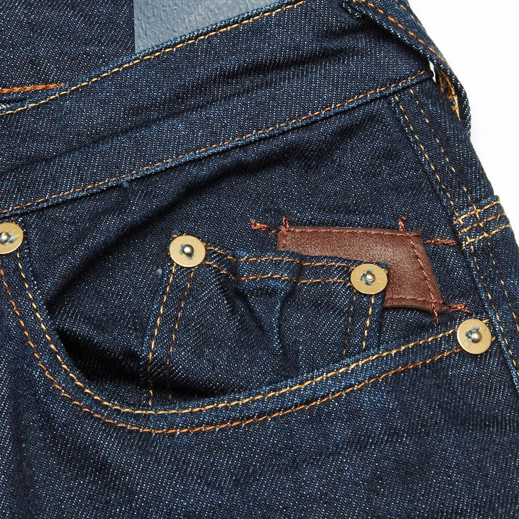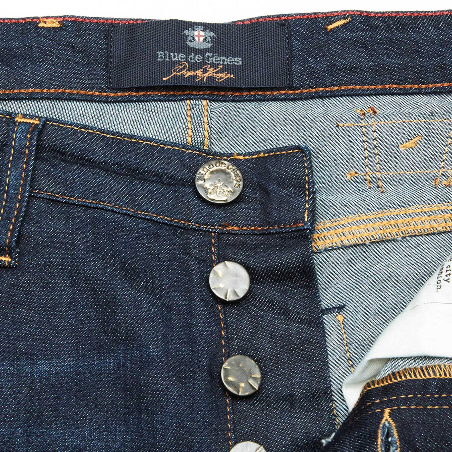 Slim Fit Five Pocket Jeans von Blue de Gênes. Schlicht in der Optik wird die Hose durch die Details erst richtig speziell. Angefangen bei kleinen Lederpatches, die an eine Reparatur erinnern über die oxidierten, gehämmerten Knöpfe am Verschluss oder die extra gefütterten, asymetrischen Gesäßtaschen für mehr Haltbarkeit. Die schöne dunkle Färbung, wie alles an der Hose in Handarbeit und ohne chemischen Mitteln gefertigt, komplettiert den außergewöhnlichen Look perfekt. Länge immer 34 Inch.