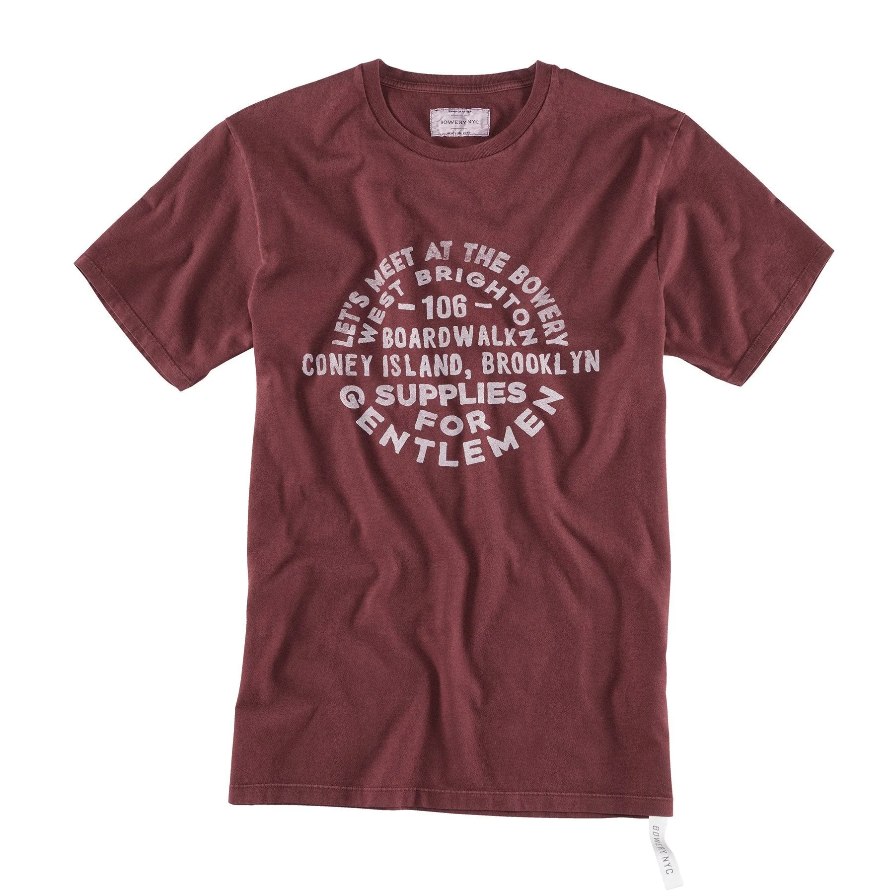 Dunkelrotes T-Shirt für Herren von Bowery NYC. Der große Print am Vorderteil in leichter Vintage Optik zeigt eine Adresse auf Coney Island. Trotz angestrengter Recherche konnten wir nicht herausfinden, was sich dahinter verbirgt. Sehr leichte, weiche Baumwolle.