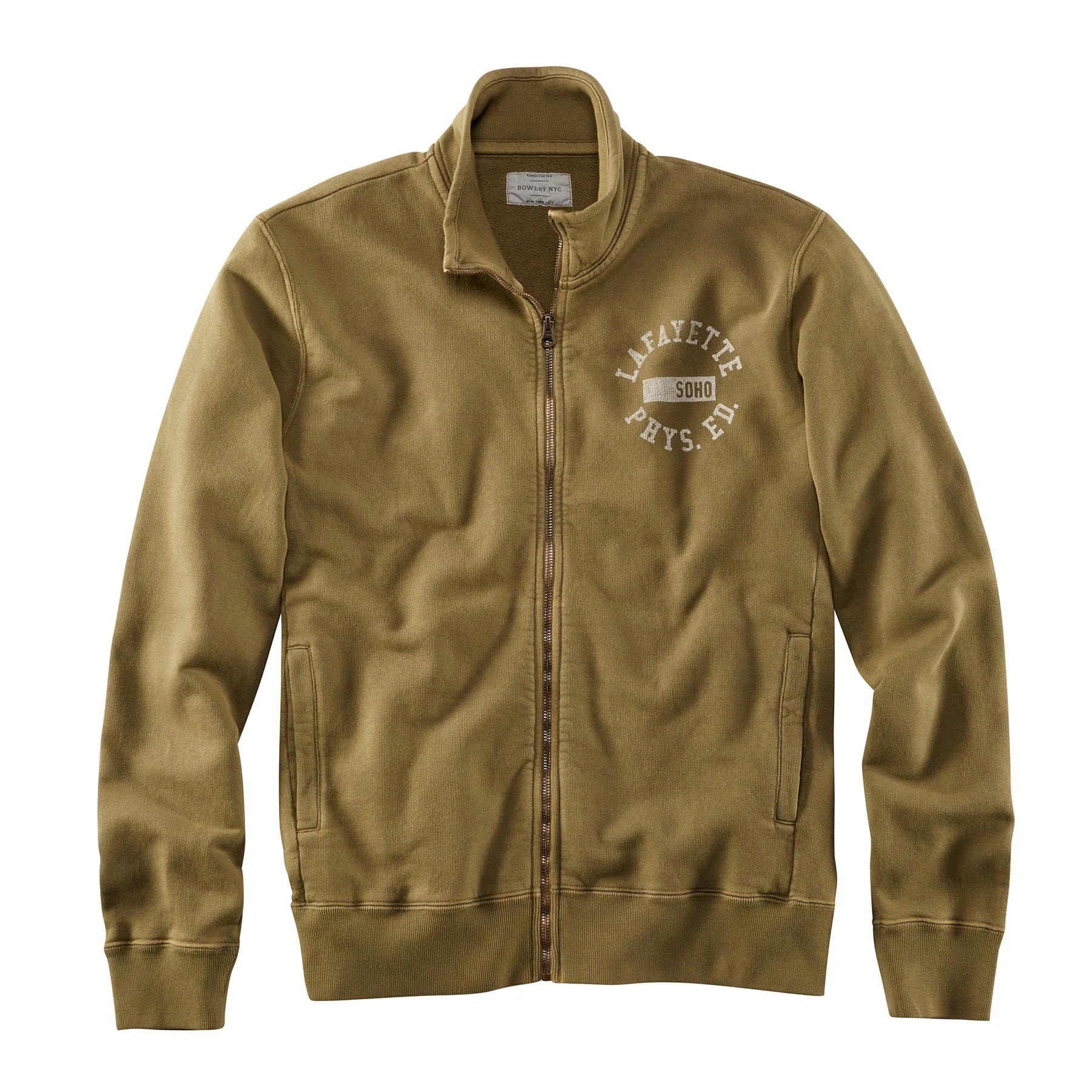 Zippjacke in Armygrün von Bowery NYC. Ein recht kleiner Print an der linken Brust in leicht verwaschener Optik lockert die sonst cleane Sweatjacke ein wenig auf. Gerade die Schlichtheit gepaart mit der dezenten Vintage Waschung verleiht einen sehr coolen Look. Tiefe Leistentaschen bieten ein wenig Stauraum, Ärmel und Bund sind mit Strickbündchen ausgestattet.