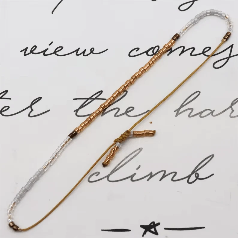 Ce bracelet Miyuki 1 rang doré est l’incarnation parfaite de l’élégance discrète. Les perles Miyuki, renommées pour leur qualité et leur finesse, sont disposées en un seul rang fin, apportant une touche raffinée à votre poignet. Leur teinte dorée est subtilement complétée par des perles transparentes blanches, créant un contraste harmonieux qui attire le regard sans en faire trop. Ce bracelet, entièrement fait main, est une pièce artisanale qui reflète un savoir-faire méticuleux.