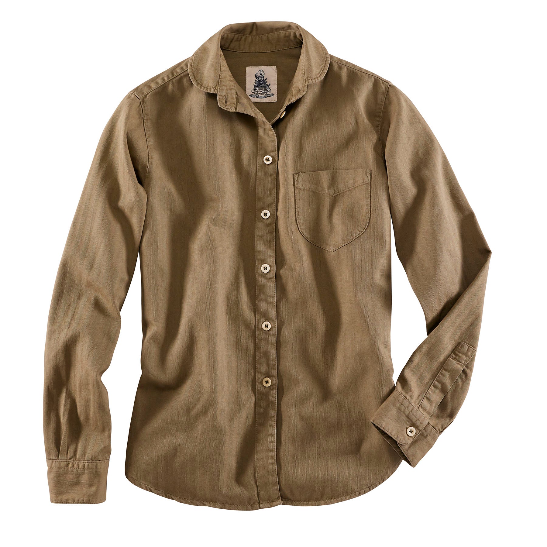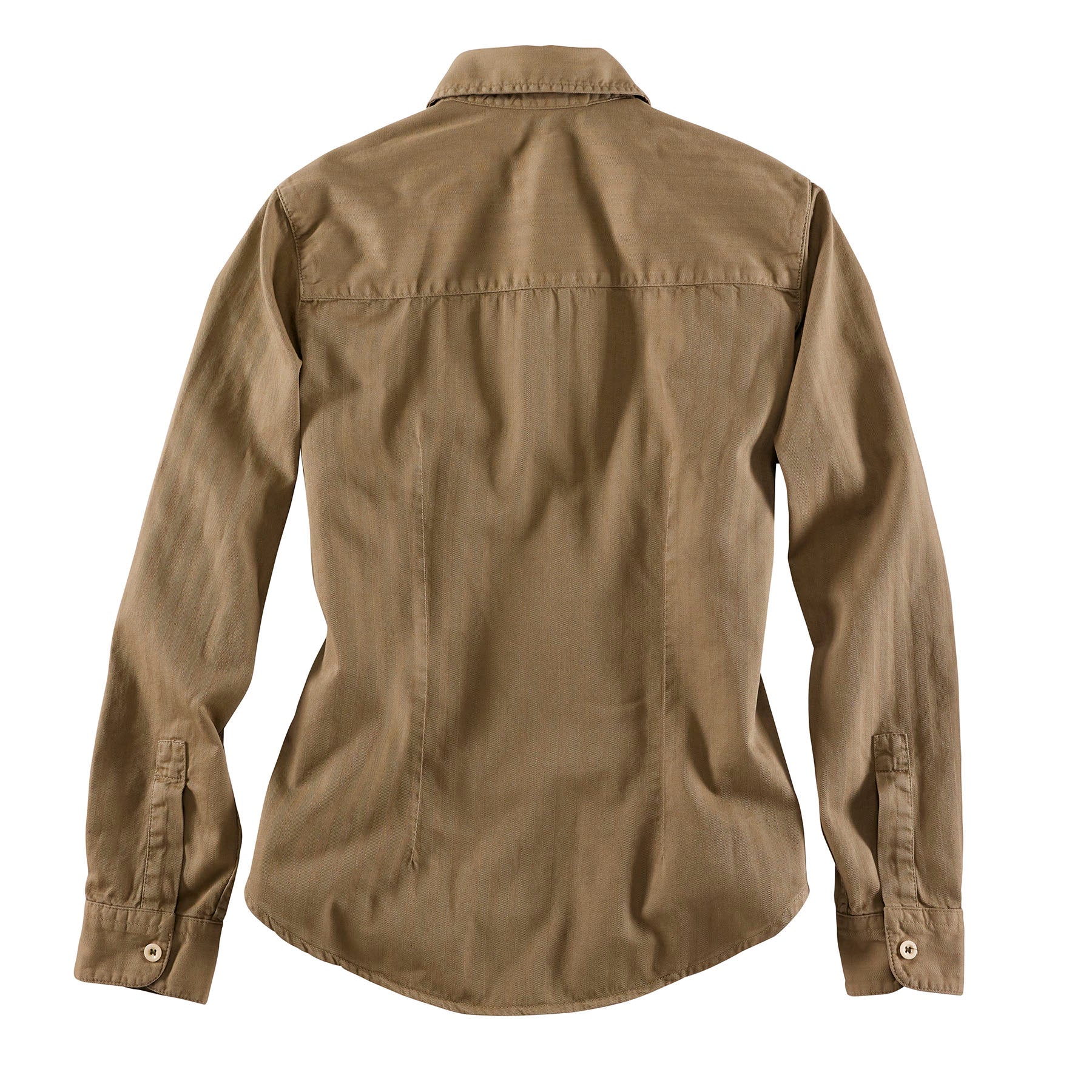 Grünes Damenhemd von Captain Santors. Durch die in sich gemusterte Baumwolle sowie die außergewöhnliche Kragenlösung bekommt das recht schlichte Hemd eine sehr spezielle Optik. Abnäher im Rückenteil sorgen für eine leichte Taillierung und den perfekten Sitz.