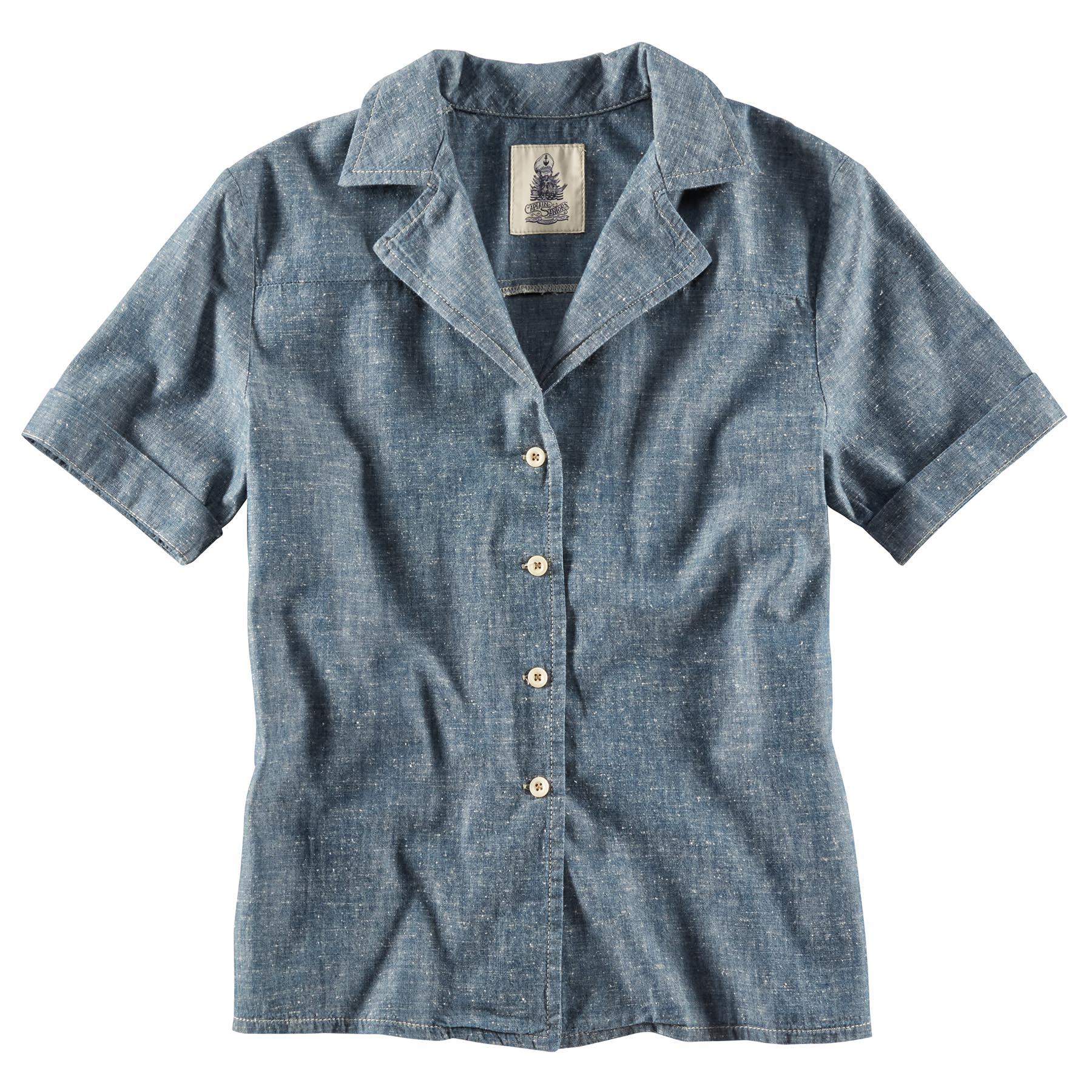 Kurzarmhemd für Damen von Captain Santors. Durch die Webart, den sogenannten Chambray, bekommt die Struktur eine ganz besondere und etwas aufgelockerte Optik. Der kleine Stehkragen, wie auch die kleinen Stulpen an den Ärmeln runden den sehr klassischen aber auch lässigen Look perfekt ab. Echte Perlmuttknöpfe und zarte Kontrastnähte komplettieren das Bild. Made in Italy vom Gewebe bis zum fertigen Hemd.