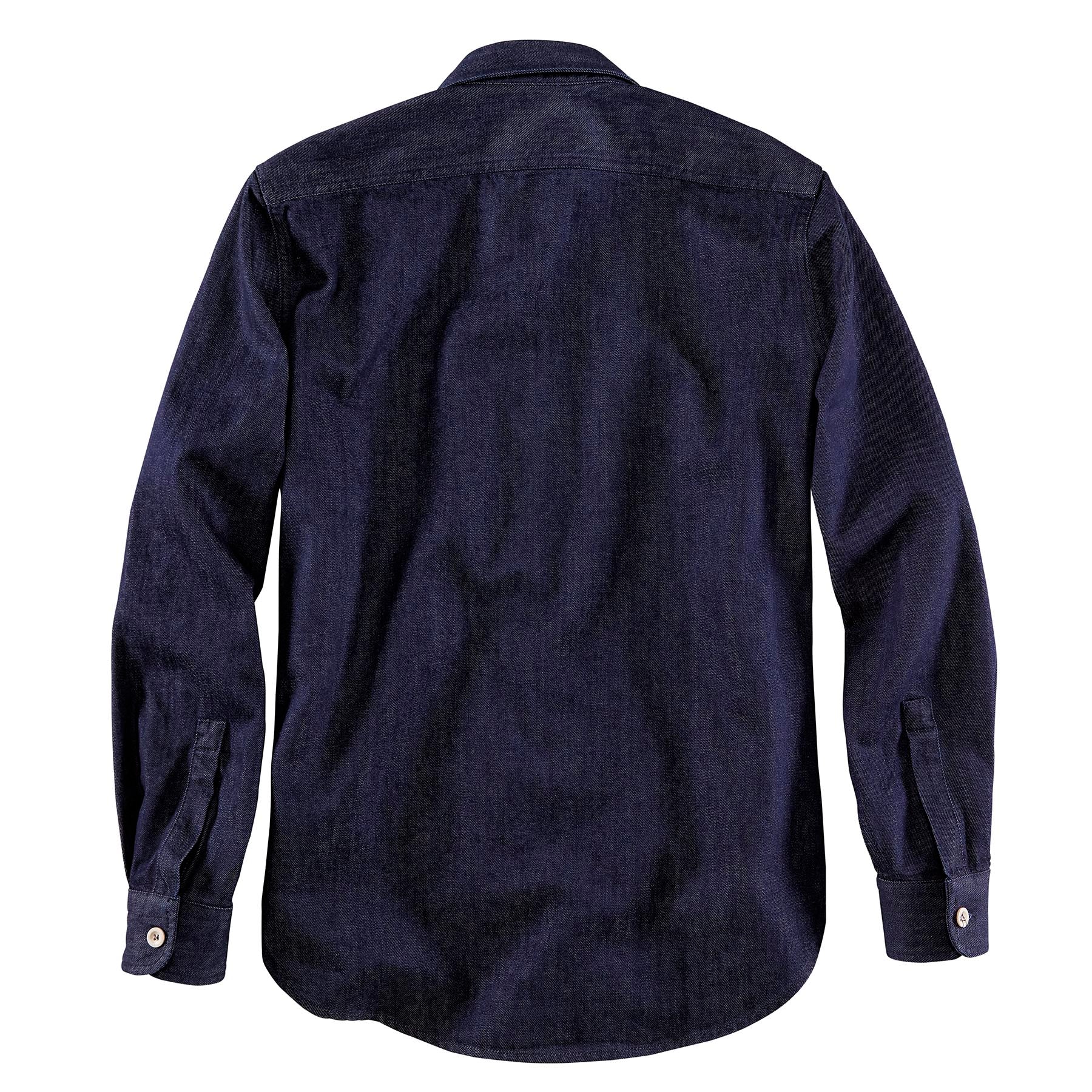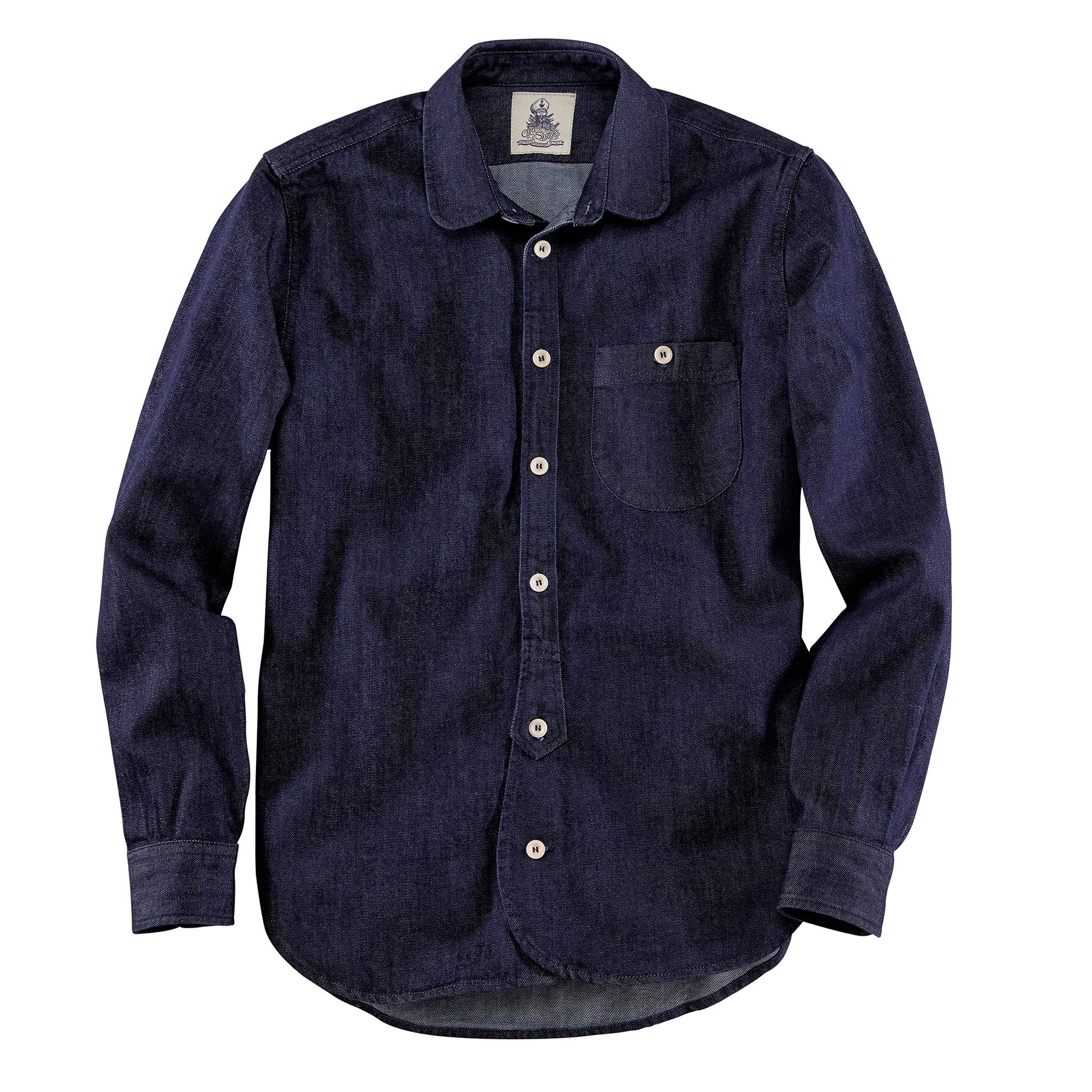 Denimhemd von Captain Santors. Im Stil der Seefahrer des letzten Jahrhunderts wurden hier kleine Details übernommen, wie z.B. der schmale, rundgeschnittene Krage oder die Lasche am vorletzten Knopf, die ursprünglich dazu diente, Hemd und Hose zu verbinden. Die hellen Hornknöpfe sind ein weiterer Eyecatcher an diesem sehr speziellen Modell. Komplett in Italien produziert.