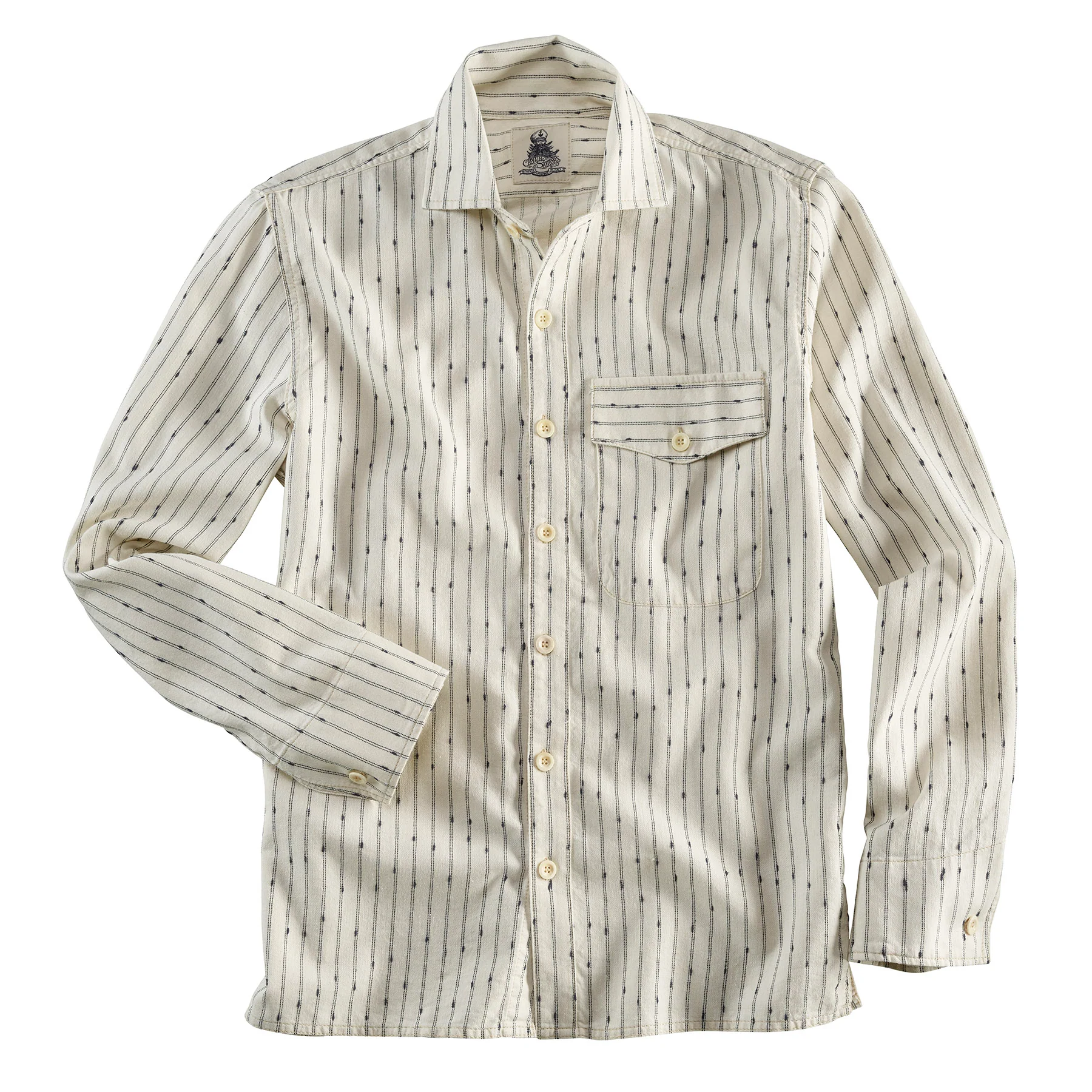 Herrenhemd aus etwas festerer Baumwolle von Captain Santors. Das außergewöhnliche Streifendesign, die größere und somit etwas auffälligere Brusttasche mit Patte und vor allem die ein wenig anders gearbeiteten Ärmelmanschetten machen dieses Hemd besonders und zu einer sehr lässigen Alternative zum herkömmlichen Stil. Komplett Made in Italy.