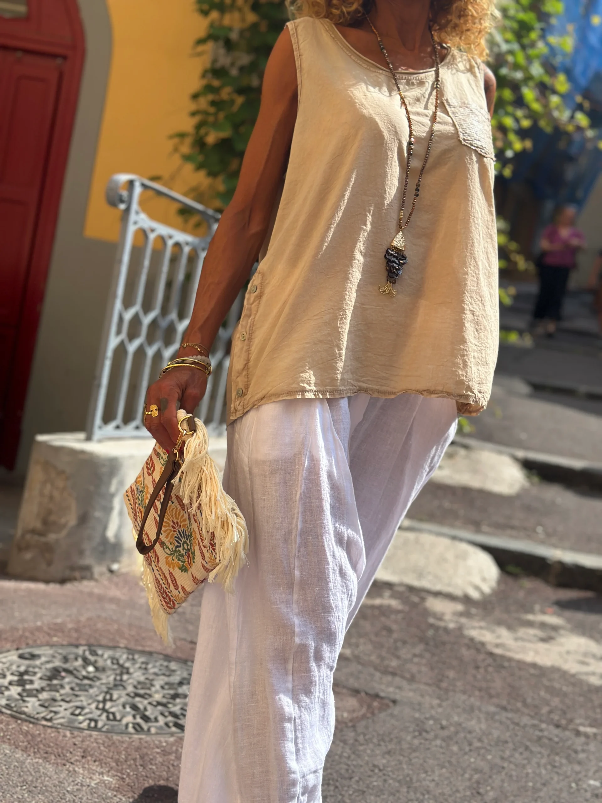𝐃𝐄𝐒𝐂𝐑𝐈𝐏𝐓𝐈𝐎𝐍 . Débardeur encolure V arrondie avec biais effet effiloché. Fabrication ITALIENNE 𝐃𝐈𝐌𝐄𝐍𝐒𝐈𝐎𝐍𝐒 . TAILLE UNIQUE, convient d’un 36 à un 44 . Longueur : 66cm ; Aisselle à aisselle : 41cm Le mannequin mesure 1m60 𝐂𝐎𝐌𝐏𝐎𝐒𝐈𝐓𝐈𝐎𝐍 . 100% coton . Lavage 30 degré