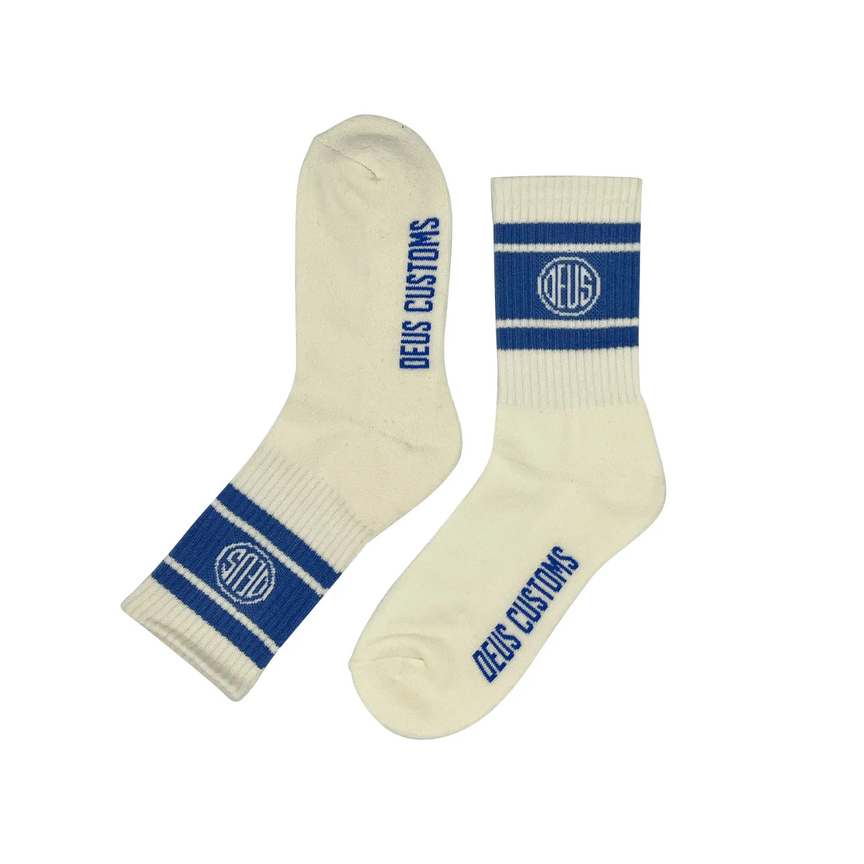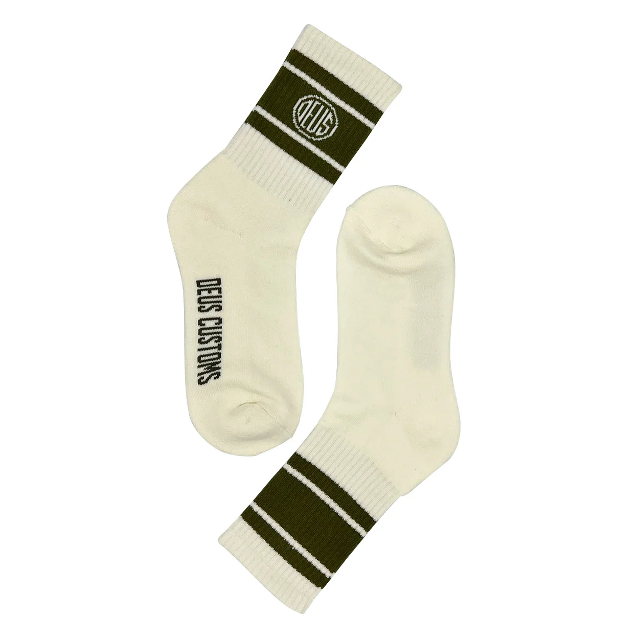 Beige Baumwollsocken im Doppelpack von Deus ex Machina. Einmal mit hellblauen Akzenten, einmal in klassischem Oliv ist das Logo an der Fußsohle eingewebt sowie die Bündchen etwas breiter farbig abgesetzt. Die Sohle ist außerdem für mehr Komfort verstärkt. US Schuhgröße 7-11 (entspricht etwa unserer Schuhgröße 39-45).