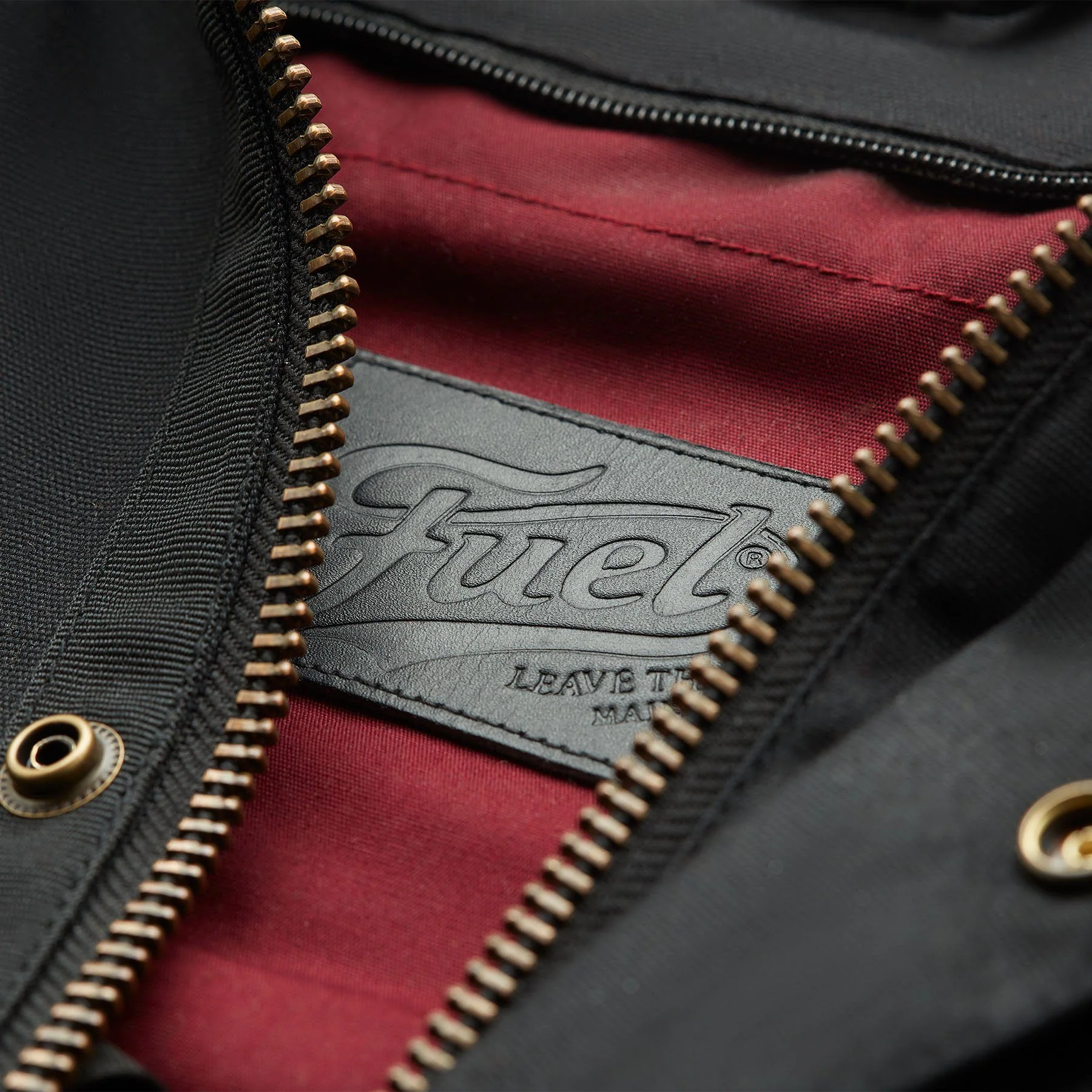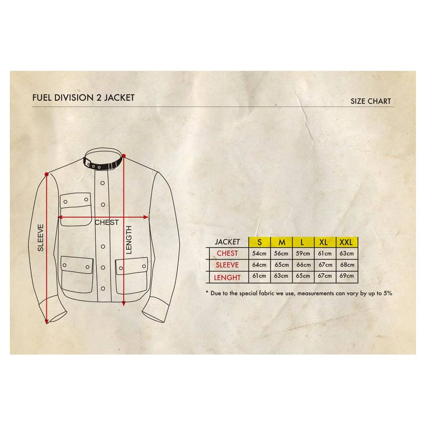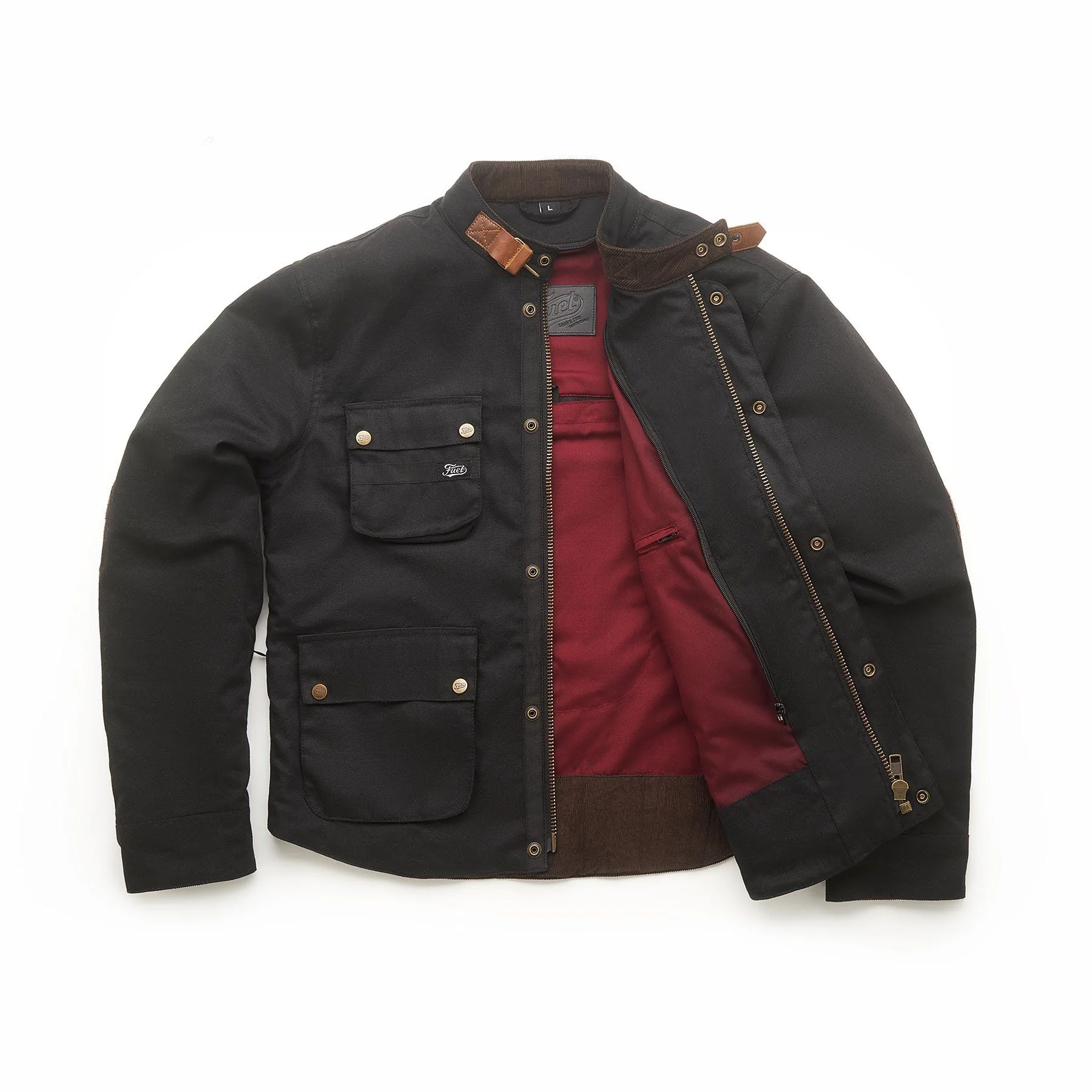 Kurze, gewachste Baumwolljacke von Fuel Motorcycles im Stil der 50er Jahre Militärjacken. Ein sehr klassischer Vintage-Look mit moderner Technologie: Robustes, wasser- und schmutzabweisendes militärisches Segeltuch mit echten Wildledereinsätzen an Ellbogen und unteren Ärmeln zum Schutz der besonders strapazierten Bereiche, verstärkt durch Kevlar an den Aufprallzonen, einer komplett wasserdichten Membran und kombiniert mit einem wärmenden Thermo-Innenfutter. Drei große wasserdichte Taschen vorne und eine wasserdichte Dokumententasche hinten. Brauner, angenehmer Cordkragen und ein hochwertiger Leder-/Messing-Kragenverschluss. Belüftungsöffnungen mittels Reißverschlüssen an Ärmeln und über dem Rücken lassen die Luftströme an heissen Tagen bestens zirkulieren. Ein herausnehmbares gestepptes Innenfutter bietet einen ganzjährigen Tragekomfort. Knöpfe aus Messing mit Fuel Logo. Inkl. herausnehmbarer CE Level 2 Protektoren an Schultern, Ellbogen und Rücken.