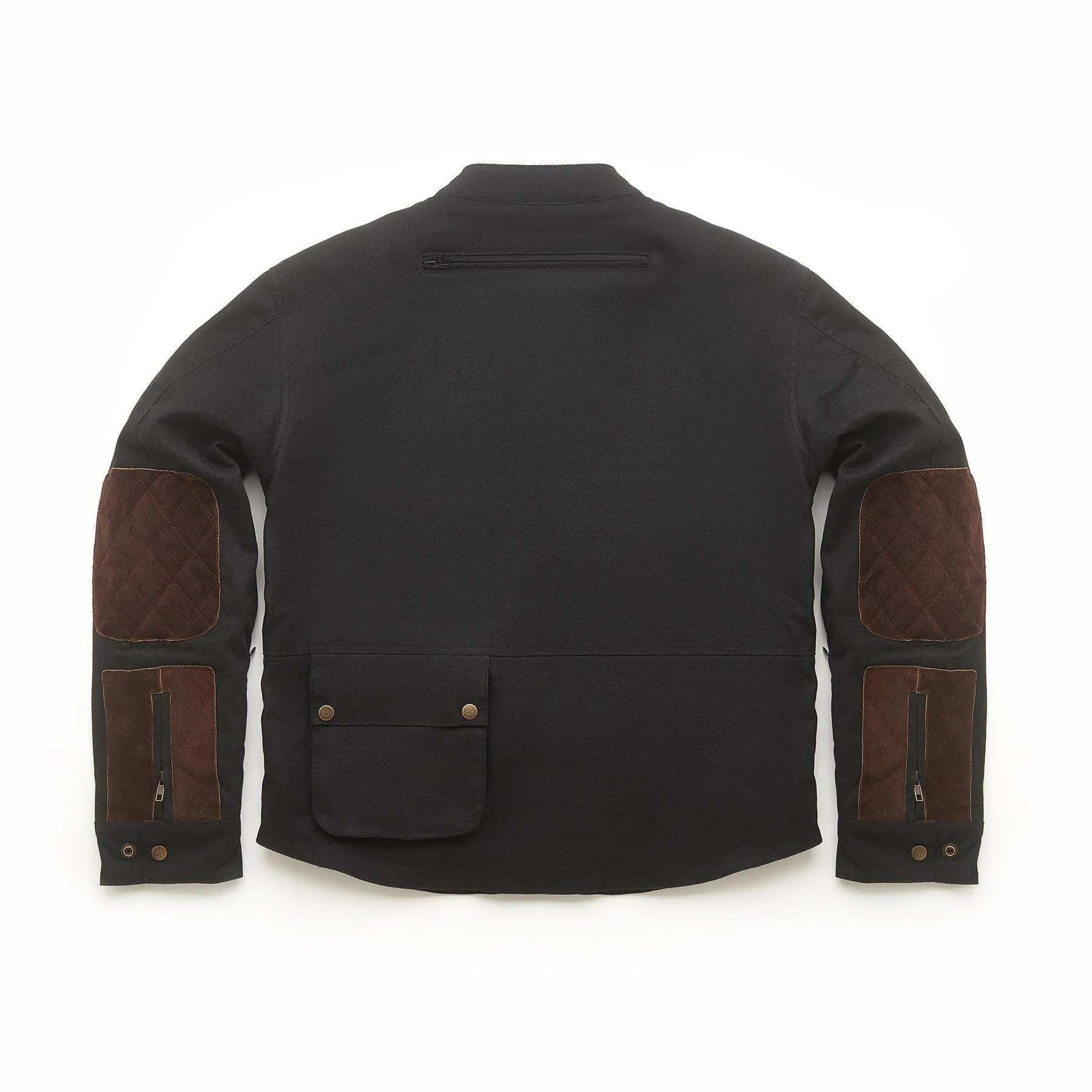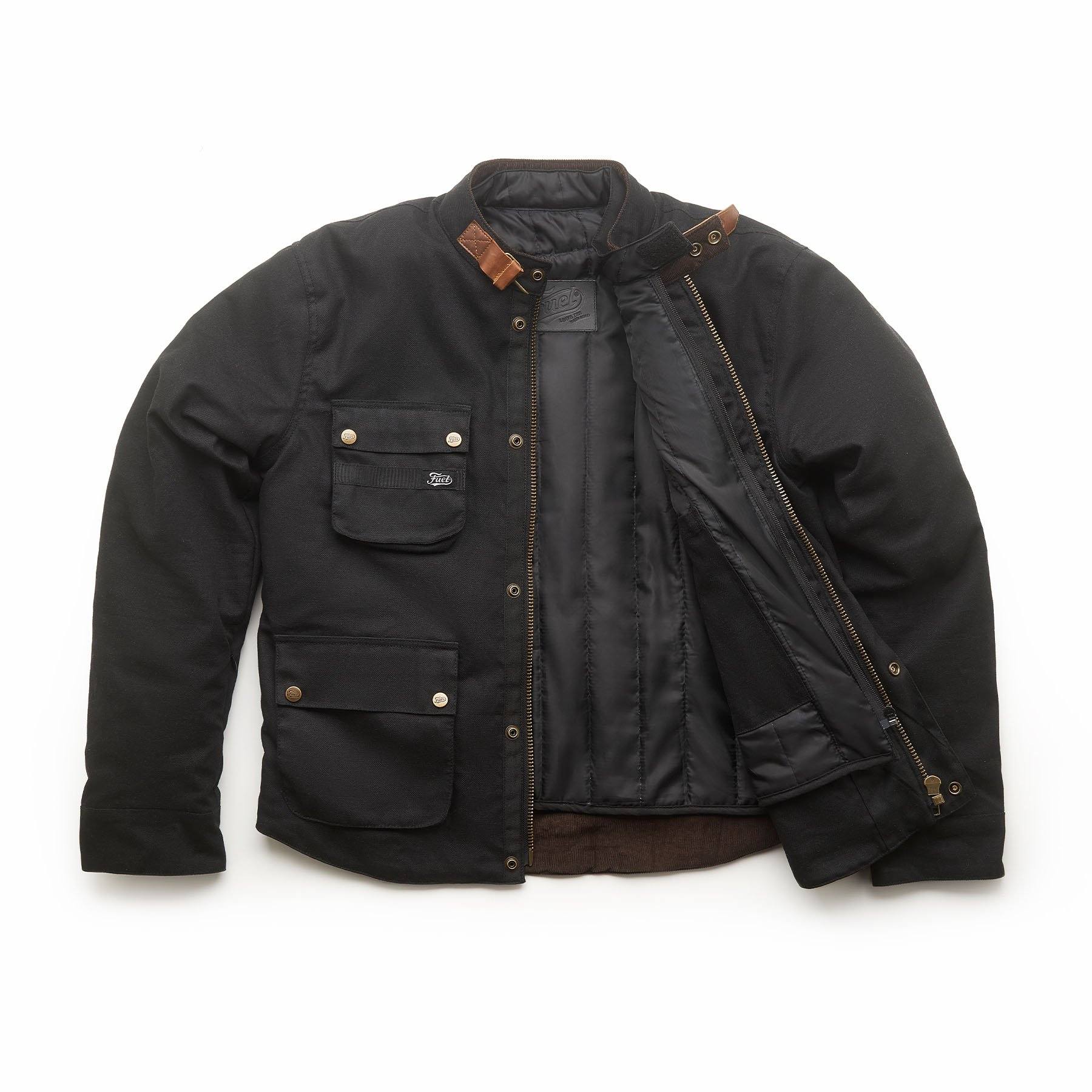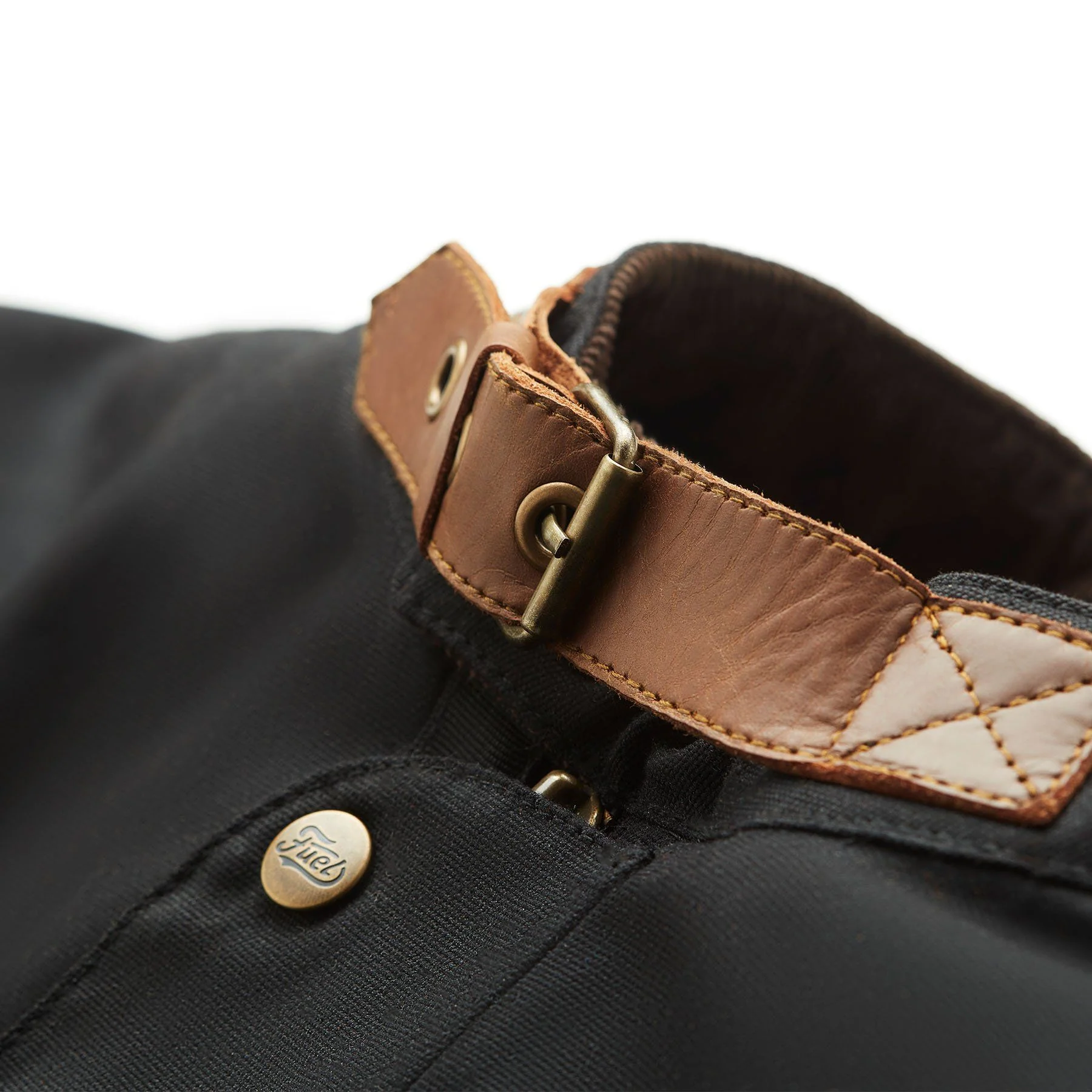 Kurze, gewachste Baumwolljacke von Fuel Motorcycles im Stil der 50er Jahre Militärjacken. Ein sehr klassischer Vintage-Look mit moderner Technologie: Robustes, wasser- und schmutzabweisendes militärisches Segeltuch mit echten Wildledereinsätzen an Ellbogen und unteren Ärmeln zum Schutz der besonders strapazierten Bereiche, verstärkt durch Kevlar an den Aufprallzonen, einer komplett wasserdichten Membran und kombiniert mit einem wärmenden Thermo-Innenfutter. Drei große wasserdichte Taschen vorne und eine wasserdichte Dokumententasche hinten. Brauner, angenehmer Cordkragen und ein hochwertiger Leder-/Messing-Kragenverschluss. Belüftungsöffnungen mittels Reißverschlüssen an Ärmeln und über dem Rücken lassen die Luftströme an heissen Tagen bestens zirkulieren. Ein herausnehmbares gestepptes Innenfutter bietet einen ganzjährigen Tragekomfort. Knöpfe aus Messing mit Fuel Logo. Inkl. herausnehmbarer CE Level 2 Protektoren an Schultern, Ellbogen und Rücken.