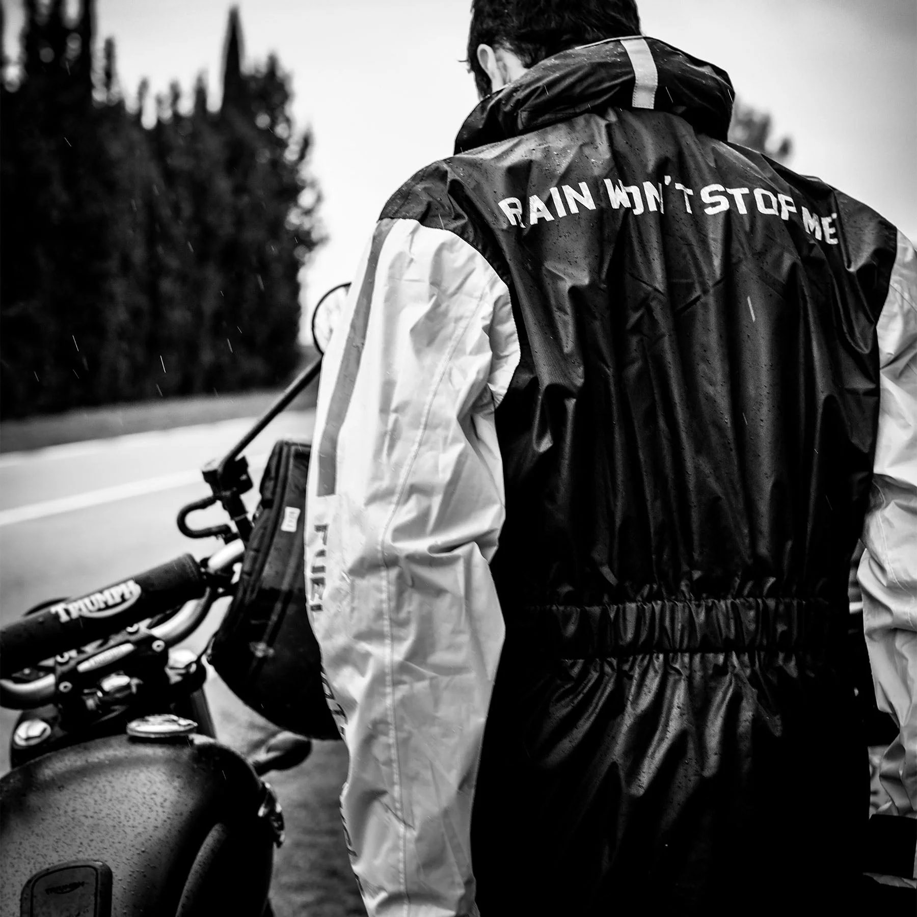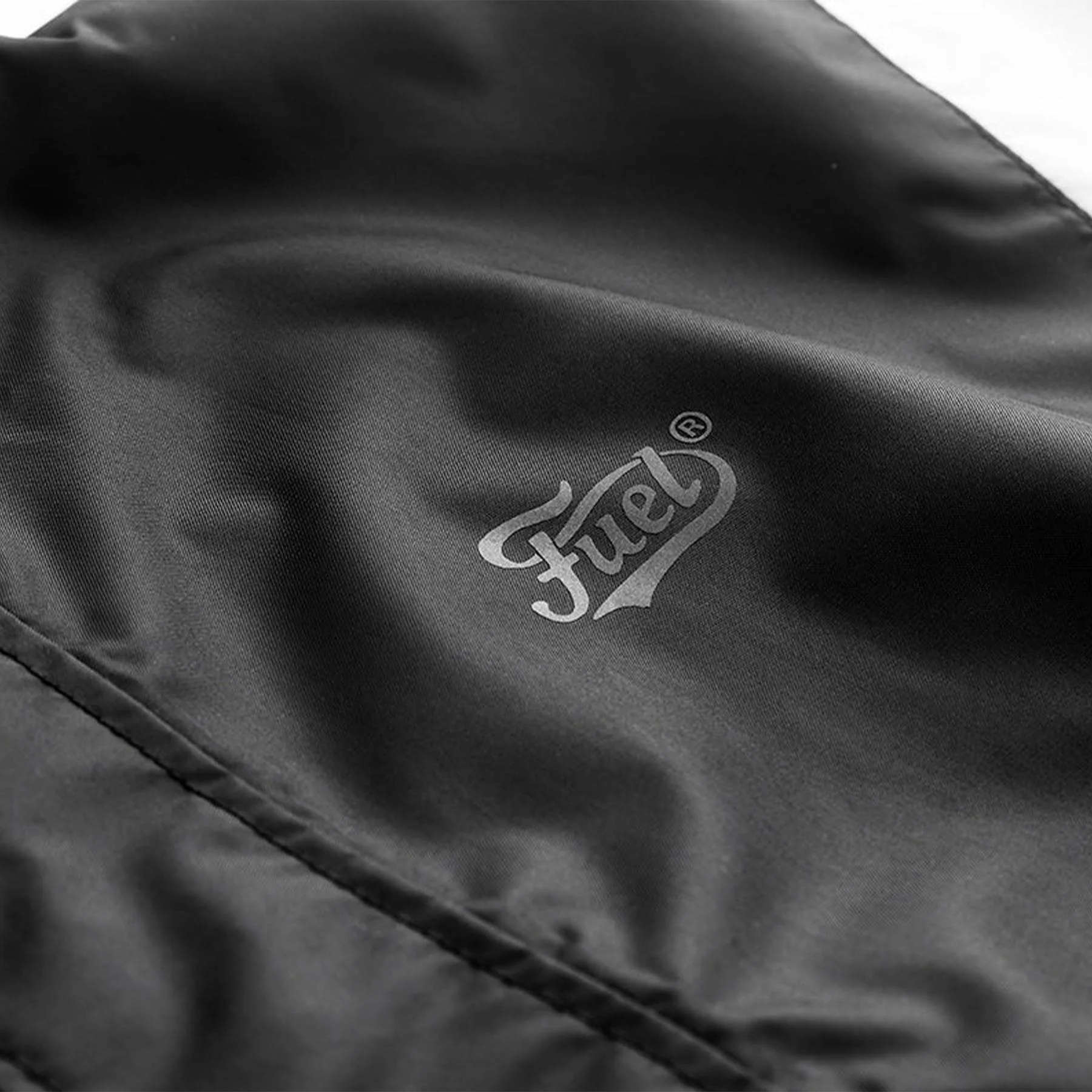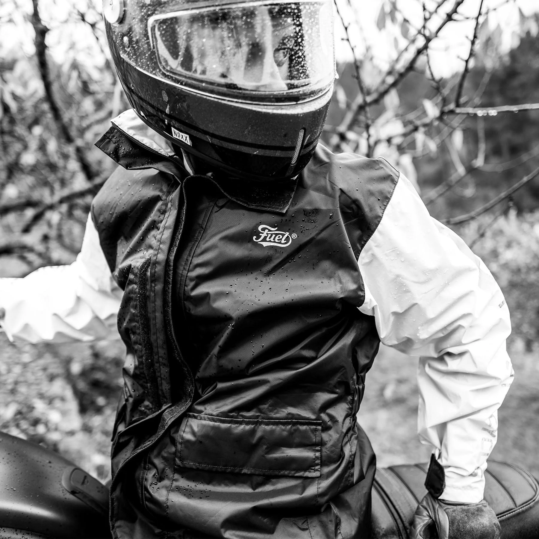 Regenjacke in Schwarz/Weiss von Fuel Motorcycles. Durch die an der Innenseite verschweissten Nähte 100% wasserdicht, ein im Rückenteil eingearbeiteter Gummizug sorgt für den perfekten Sitz. Der Reissverschluss vorne ist durch einen Übertritt mit Klettverschluss zusätzlich schnell verschließbar. Auch die Taschen sind mit Klett ausgestattet, sodass selbst mit dickeren Handschuhen der Zugriff schnell und vor allem trocken erfolgen kann. Durch die im Kragen eingearbeitete Kapuze ist die Jacke auch abseits des Motorrads ein perfekter Schutz. Die weissen Ärmel und die reflektierenden Details, auch am Rücken, sorgen für Sichtbarkeit und Schutz im Strassenverkehr. In die mitgelieferte Tasche kann die Jacke platzsparend verstaut werden.