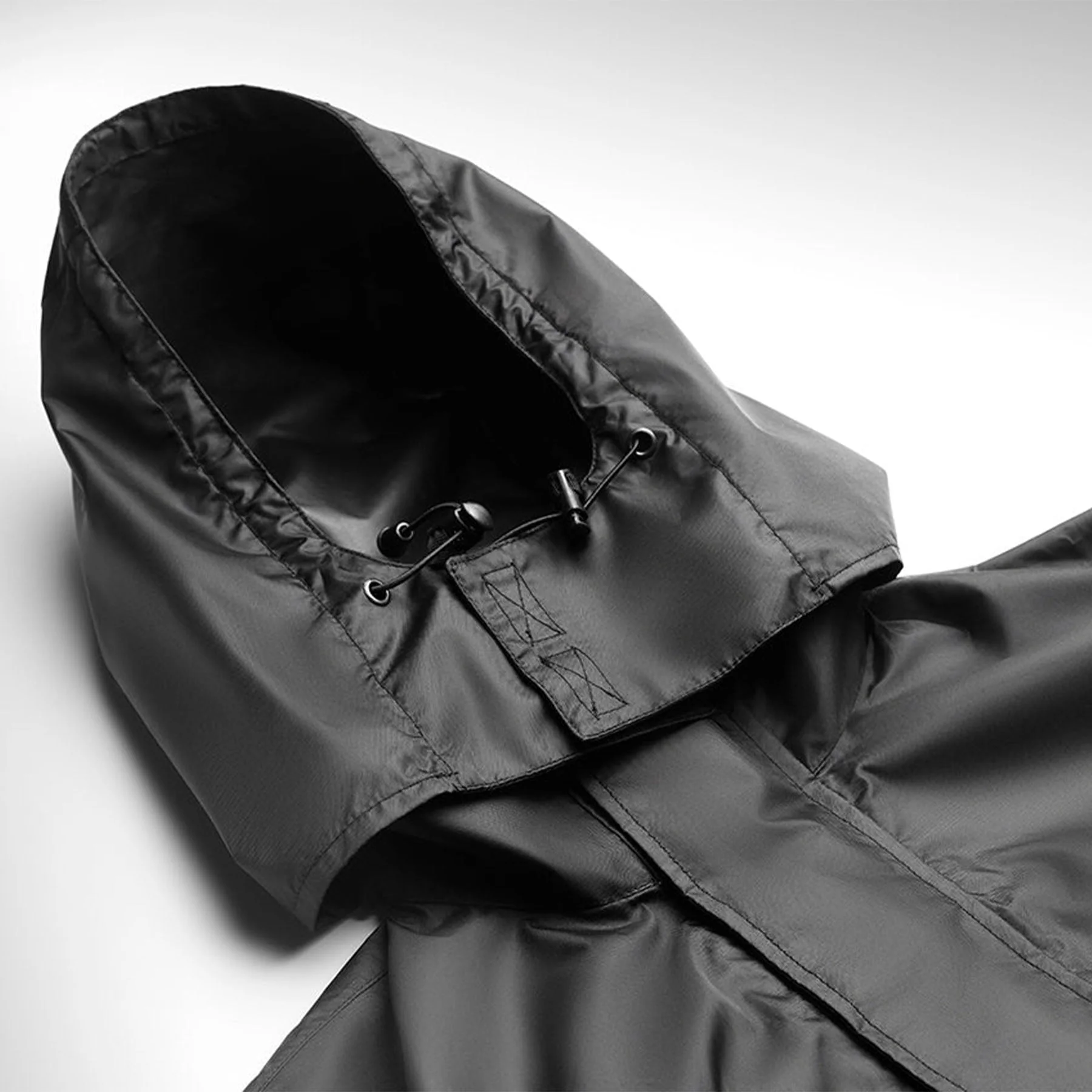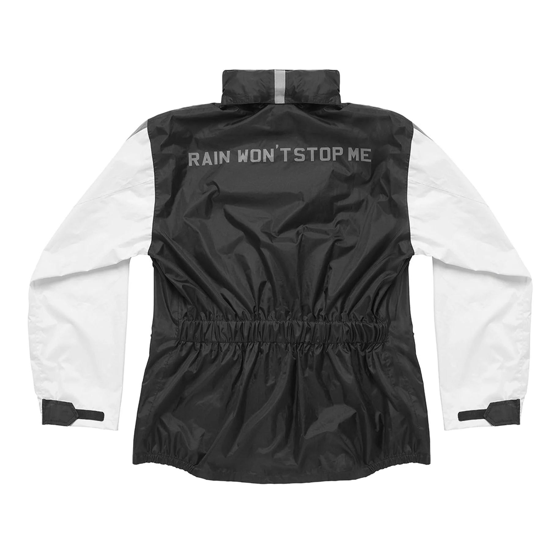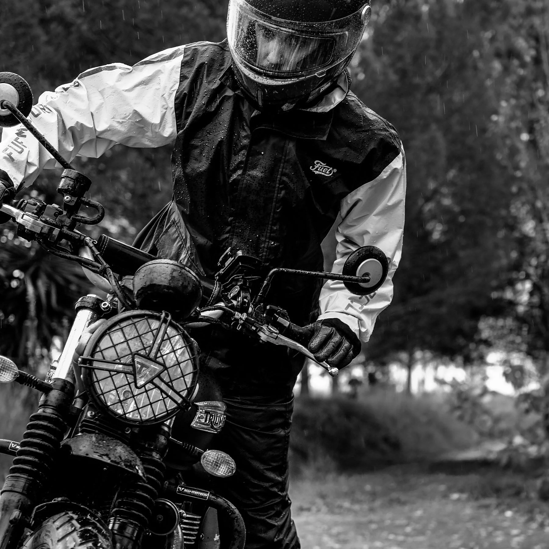 Regenjacke in Schwarz/Weiss von Fuel Motorcycles. Durch die an der Innenseite verschweissten Nähte 100% wasserdicht, ein im Rückenteil eingearbeiteter Gummizug sorgt für den perfekten Sitz. Der Reissverschluss vorne ist durch einen Übertritt mit Klettverschluss zusätzlich schnell verschließbar. Auch die Taschen sind mit Klett ausgestattet, sodass selbst mit dickeren Handschuhen der Zugriff schnell und vor allem trocken erfolgen kann. Durch die im Kragen eingearbeitete Kapuze ist die Jacke auch abseits des Motorrads ein perfekter Schutz. Die weissen Ärmel und die reflektierenden Details, auch am Rücken, sorgen für Sichtbarkeit und Schutz im Strassenverkehr. In die mitgelieferte Tasche kann die Jacke platzsparend verstaut werden.