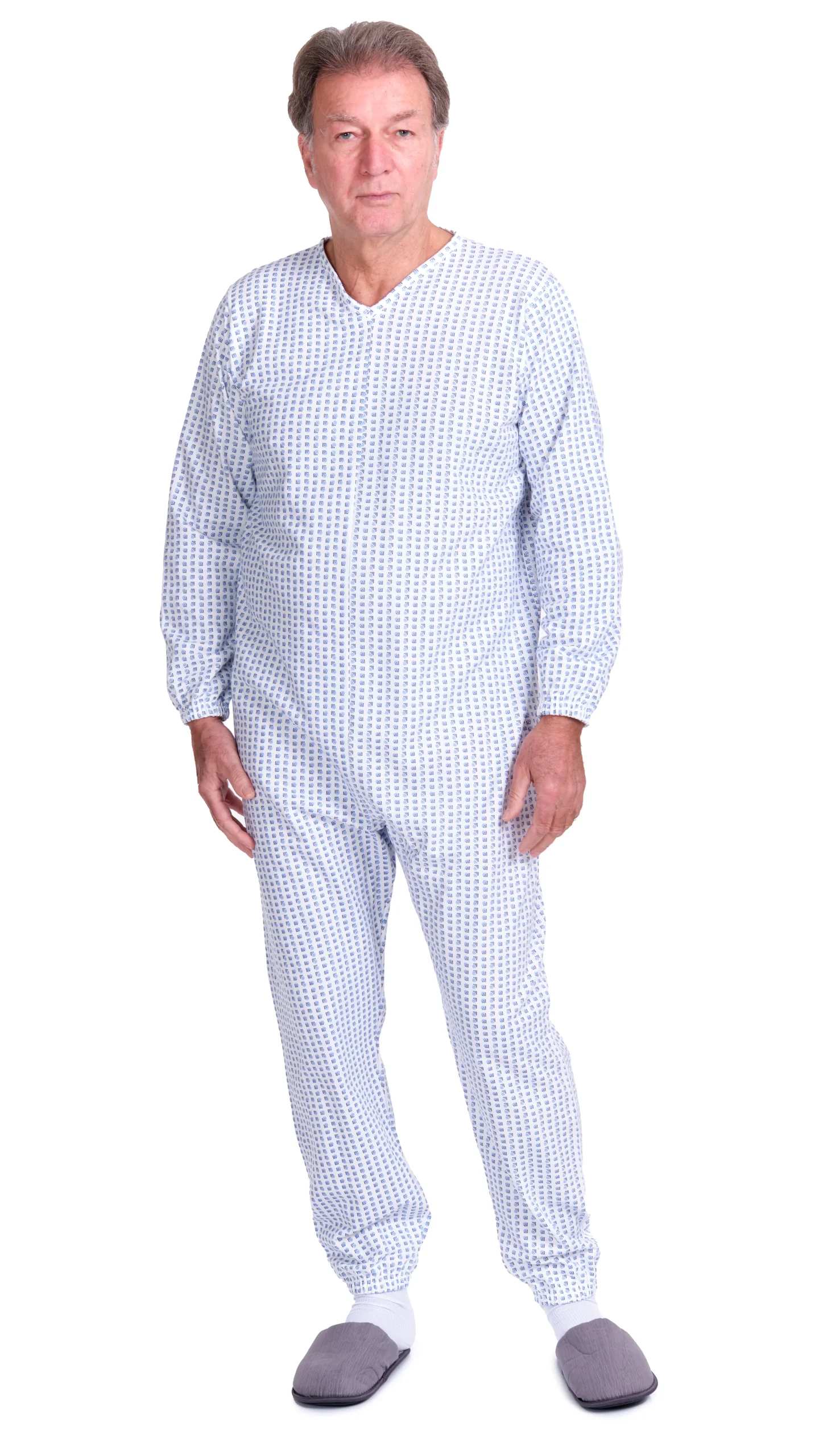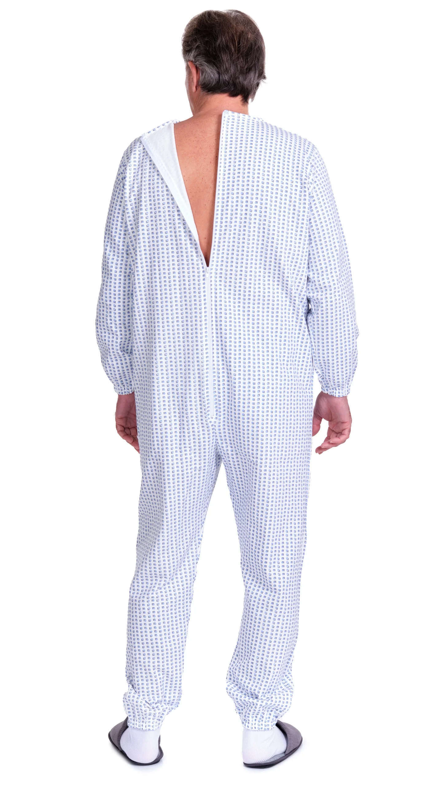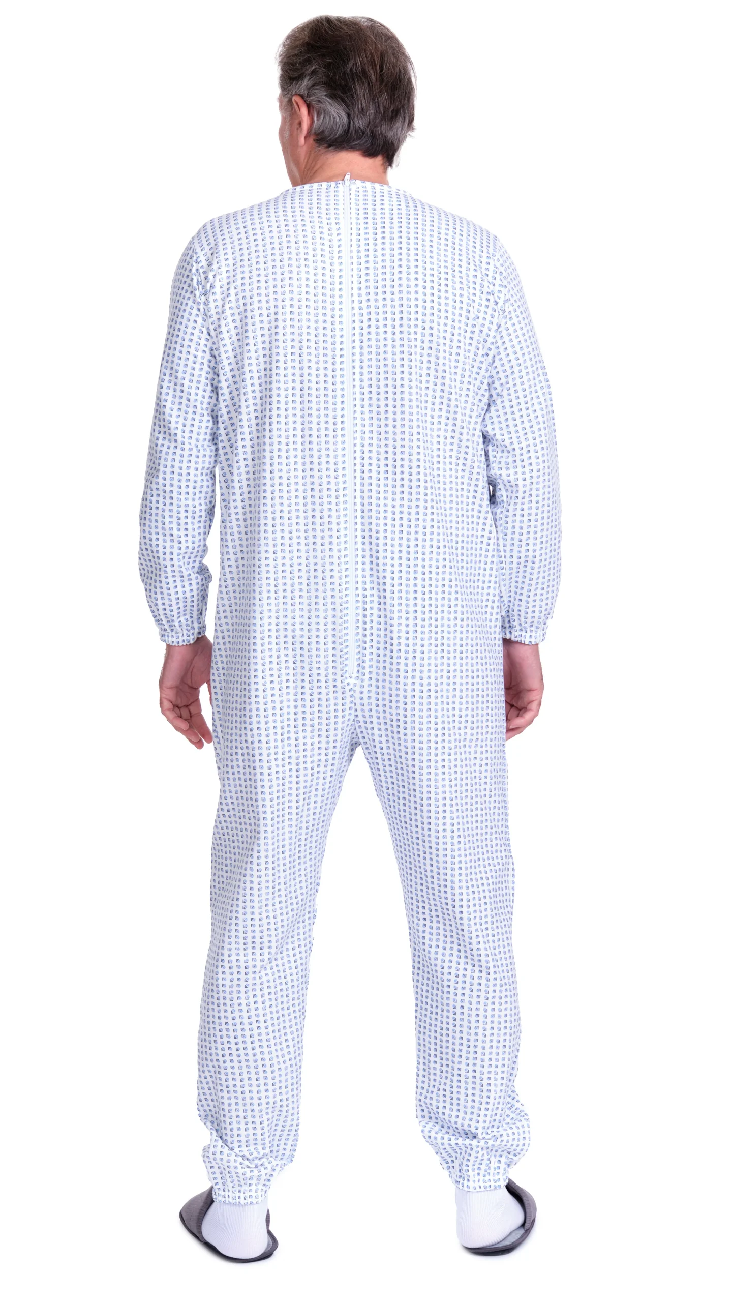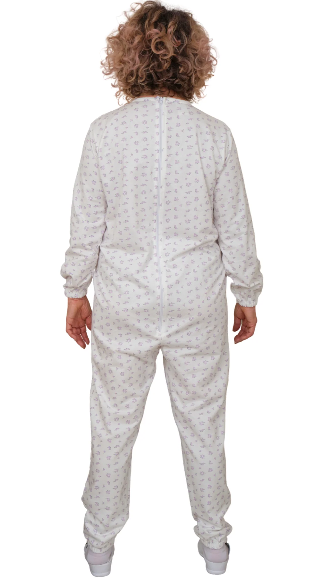 Cette grenouillère combine confort et esthétique, avec une couleur blanc laiteux assortie de micro-motifs. Son design élégant permet à l’utilisateur de se sentir bien dans son vêtement tout en répondant à ses besoins fonctionnels. La simplicité et la discrétion du motif en font un choix idéal pour les environnements hospitaliers ou à domicile.