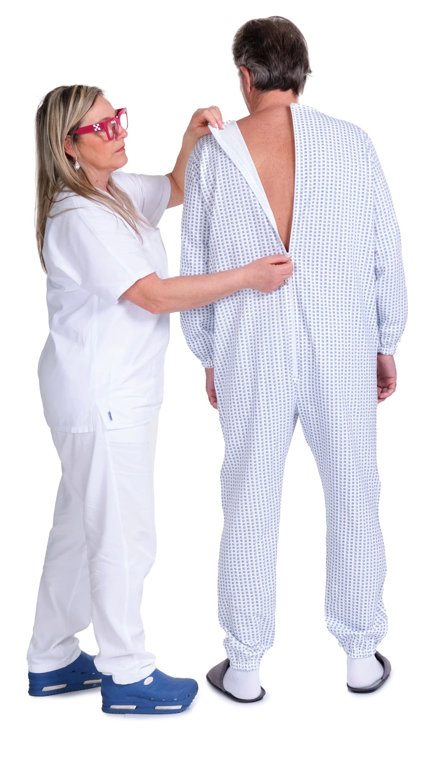 La fermeture à glissière dans le dos permet aux soignants de changer facilement les aides sans avoir à perturber le confort du patient. Ce système simple et efficace permet une gestion rapide et discrète des besoins hygiéniques tout en préservant la dignité de l’utilisateur.