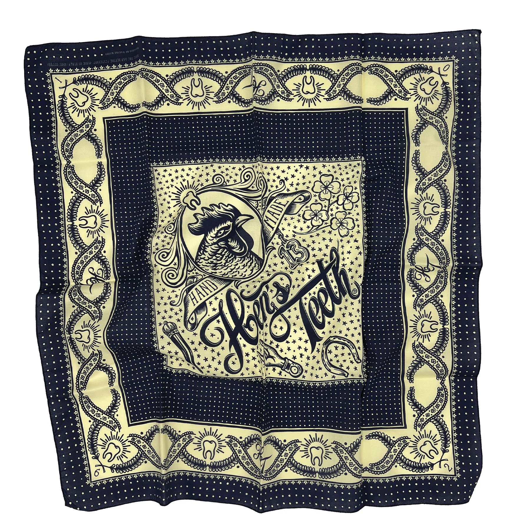 Dunkelblaues Bandana, ca. 60×60 cm, aus reiner Baumwolle von Hen’s Teeth. In sehr edlem Retrostil sind mittig einige Glücksymbole zu sehen, umrahmt mit klassischen Vintagemustern, die natürlich von diversen Hühnerzähnchen und Hen’s Teeth Symbolen durchbrochen werden. Färbung und Fertigung erfolgen komplett ohne chemische Zusätze oder Produktionsschritten, wodurch das Tuch unglaublich weich und leicht ist.