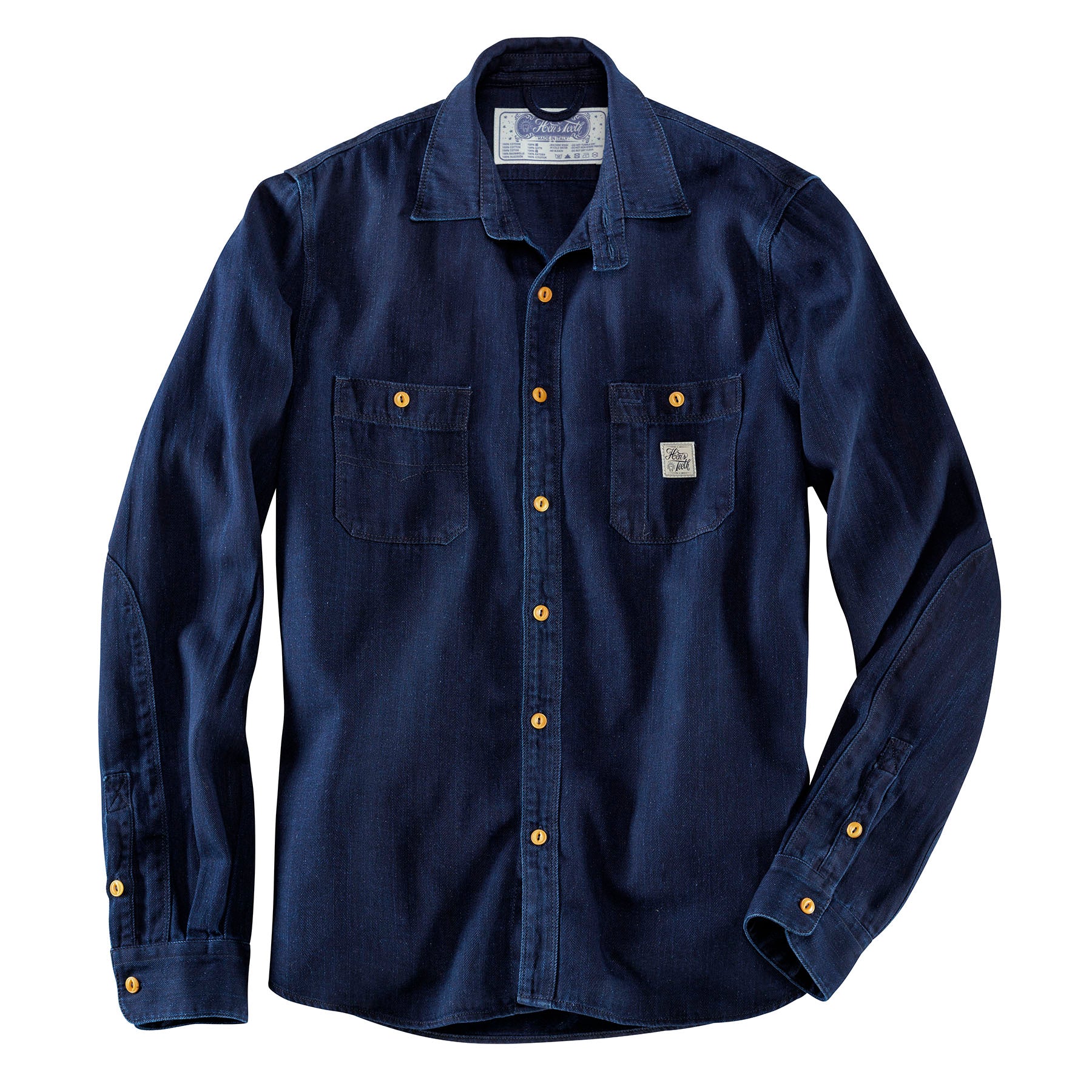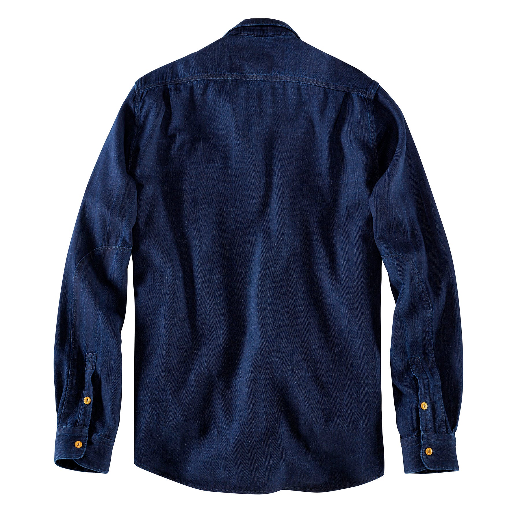 Langarmhemd in Fischgrätmuster von Hen’s Teeth. Durch die Indigo Färbung ist diese spezielle Struktur erst auf den zweiten Blick so richtig erkennbar. Auch die aufwendigen Doppel- und teilweise Dreifachsteppungen sind kaum sichtbar, sorgen aber für eine extreme Langlebigkeit. Die beiden Brusttaschen sind leicht unterschiedlich gearbeitet, die linke verfügt außerdem über einen kleinen extra Schlitz für Stifte. Die echten Steinnußknöpfe runden die sehr edle aber auch sehr coole Optik perfekt ab. Natürlich komplett Made in Italy.