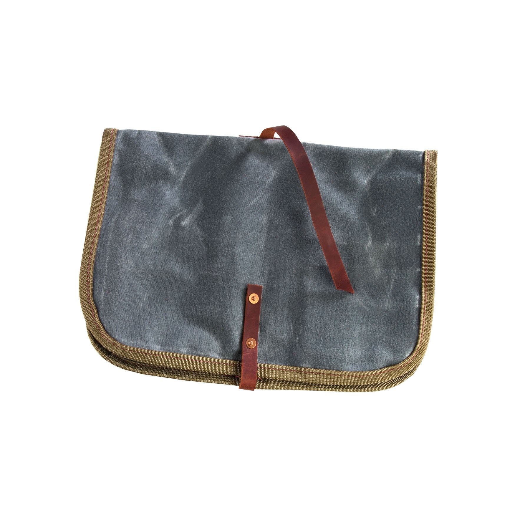 Werkzeugtasche aus gewachster Baumwolle von Iron & Resin. 16 Einschubfächer sowie zwei größere Taschen, eine mit Reissverschluss verschließbar, bieten ausreichend Platz für viele nützliche Utensilien. Durch ein langes Lederband schnell und praktisch zu schließen. Maße offen: ca. 43×31 cm.