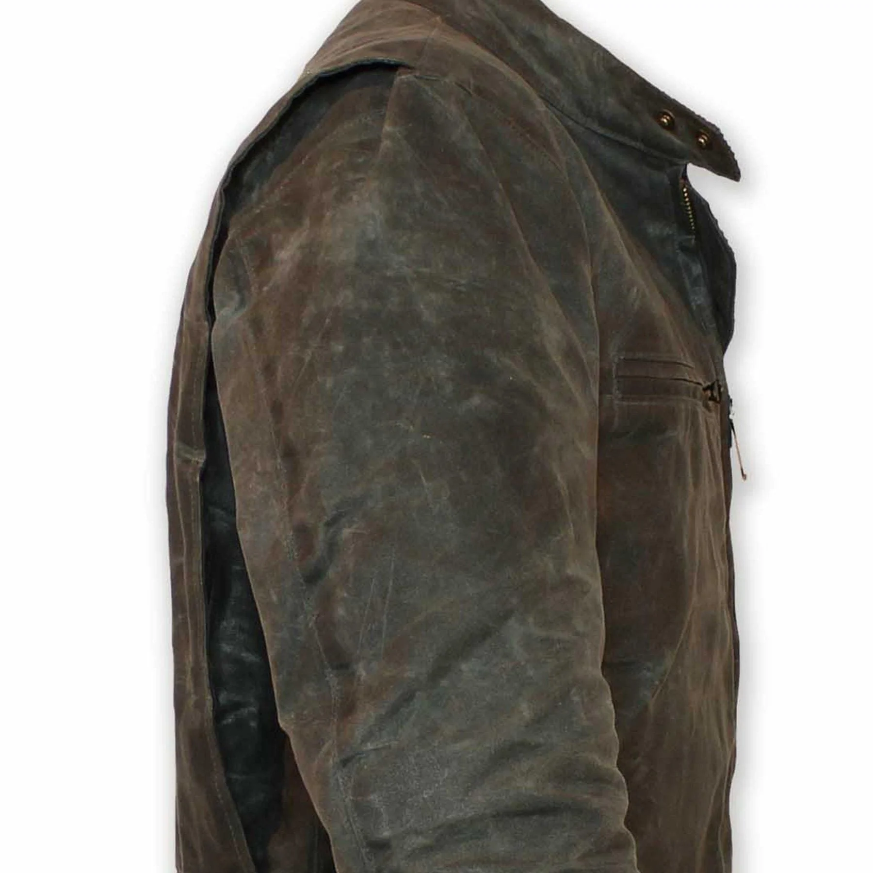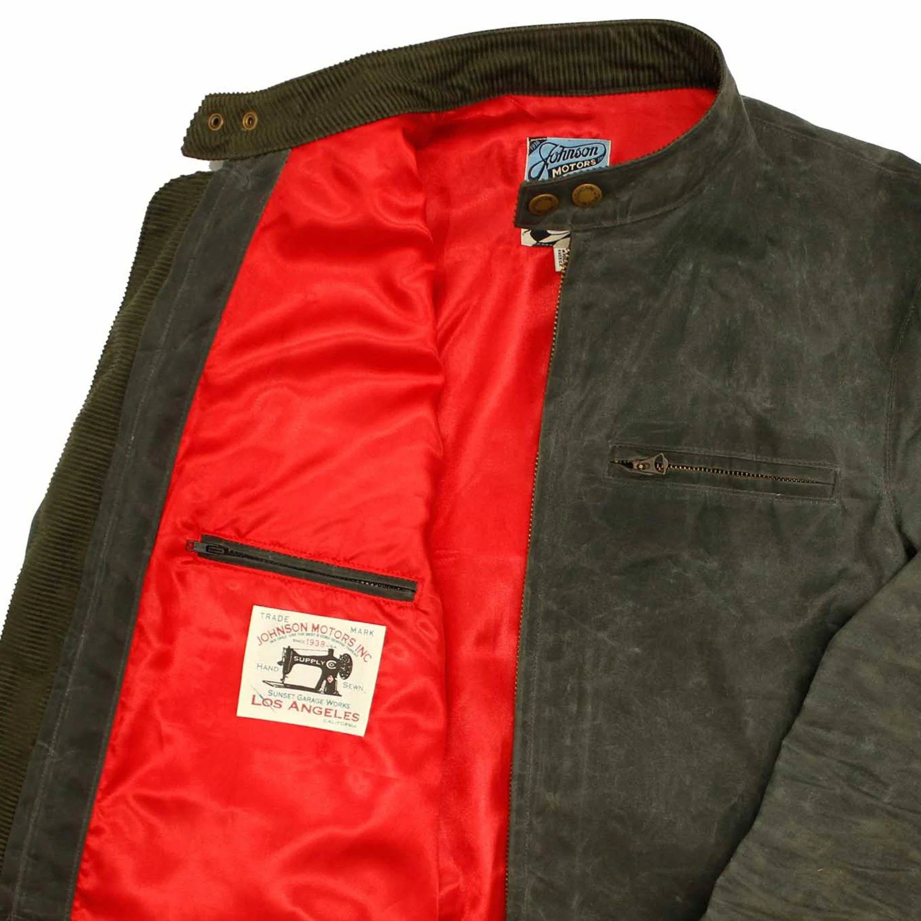 Gewachste Baumwolljacke von Johnson Motors. Das verwendete Material stammt aus einer der ältesten Webereien in Schottland, der Halley Stevenson Company. Als einer der führenden Hersteller von gewachster Baumwolle produzieren sie dort auf rein pflanzlicher Basis mit geringster Umweltbelastung und jahrelangen Know How. Das bedeutet, dass das Wachs nicht nur so in die Faser eingearbeitet ist, das die Jacke nahezu wasserdicht ist, sondern dass das Wachs auch durch das Tragen an der Oberfläche eine ganz besondere Optik erzeugt, die wie Leder wirkt. Dennoch ist die Jacke atmungsaktiv. Das leuchtend rote Innenfutter rundet den außergewöhnlichen Look sehr schön ab. Ein klassisch schlichtes Modell im Stil der 1950/60er Jahre, das genau deshalb sensationell einzigartig ist. Komplett Made in Downtown LA, USA.