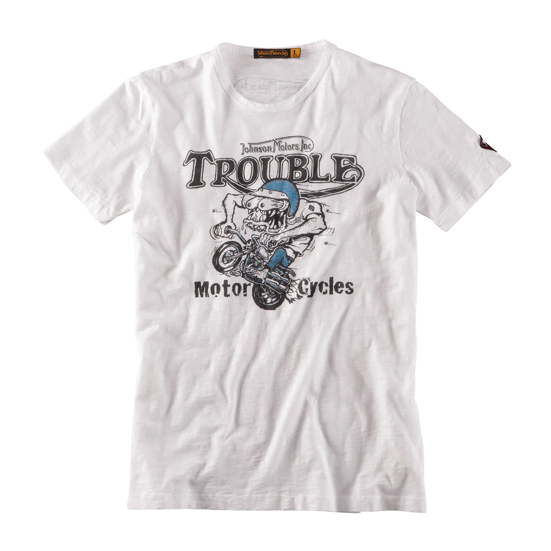 Kurzarmshirt mit großem Print von Johnson Motors. Der hässliche Kerl auf dem Motorrad ist JoMo’s Interpretation des Fehlerteufels, der so gerne im Detail steckt und für unerwartete Komplikationen am Bike sorgt. Am hinteren Halsausschnitt ist sehr dezent das Johnson Logo aufgedruckt.