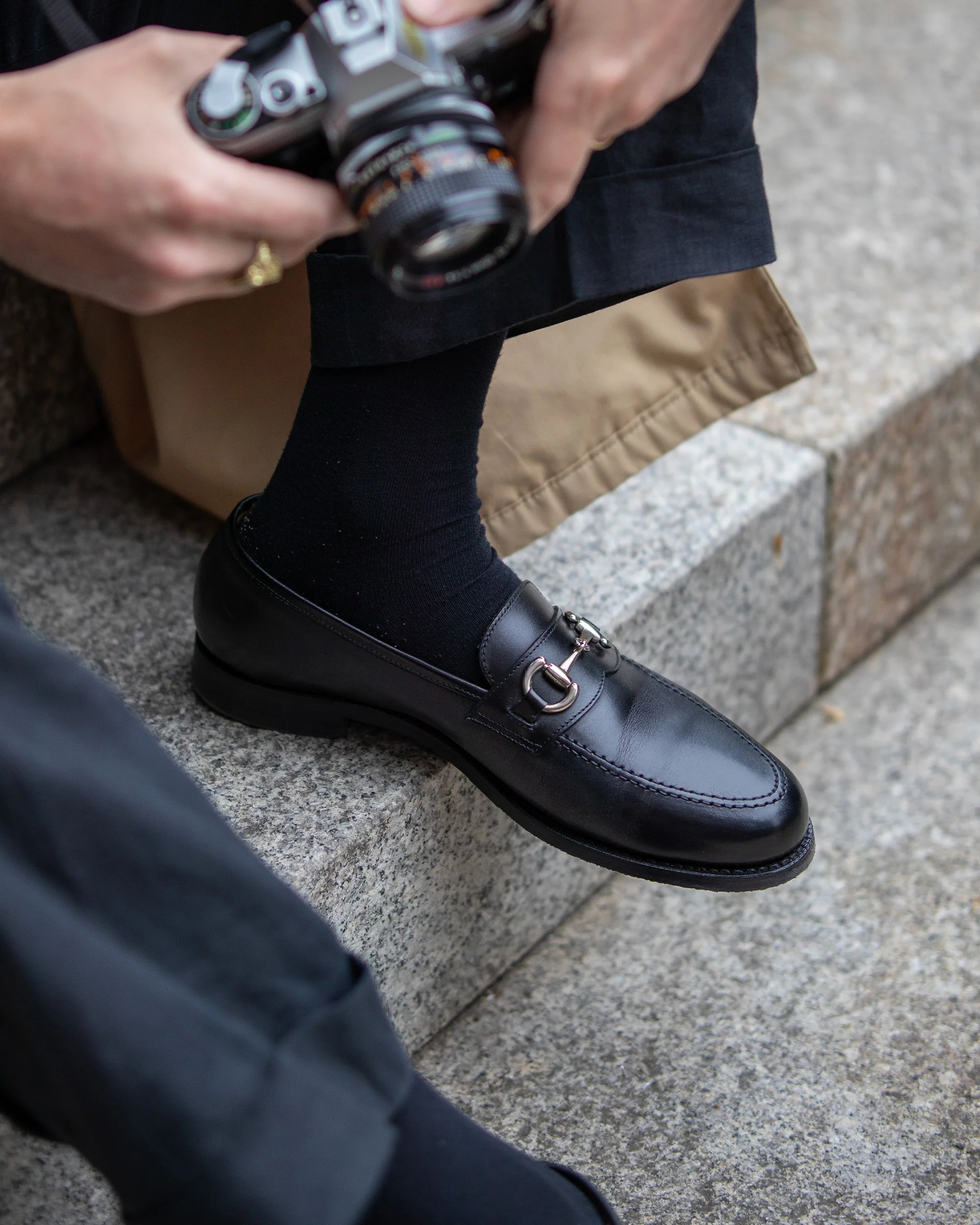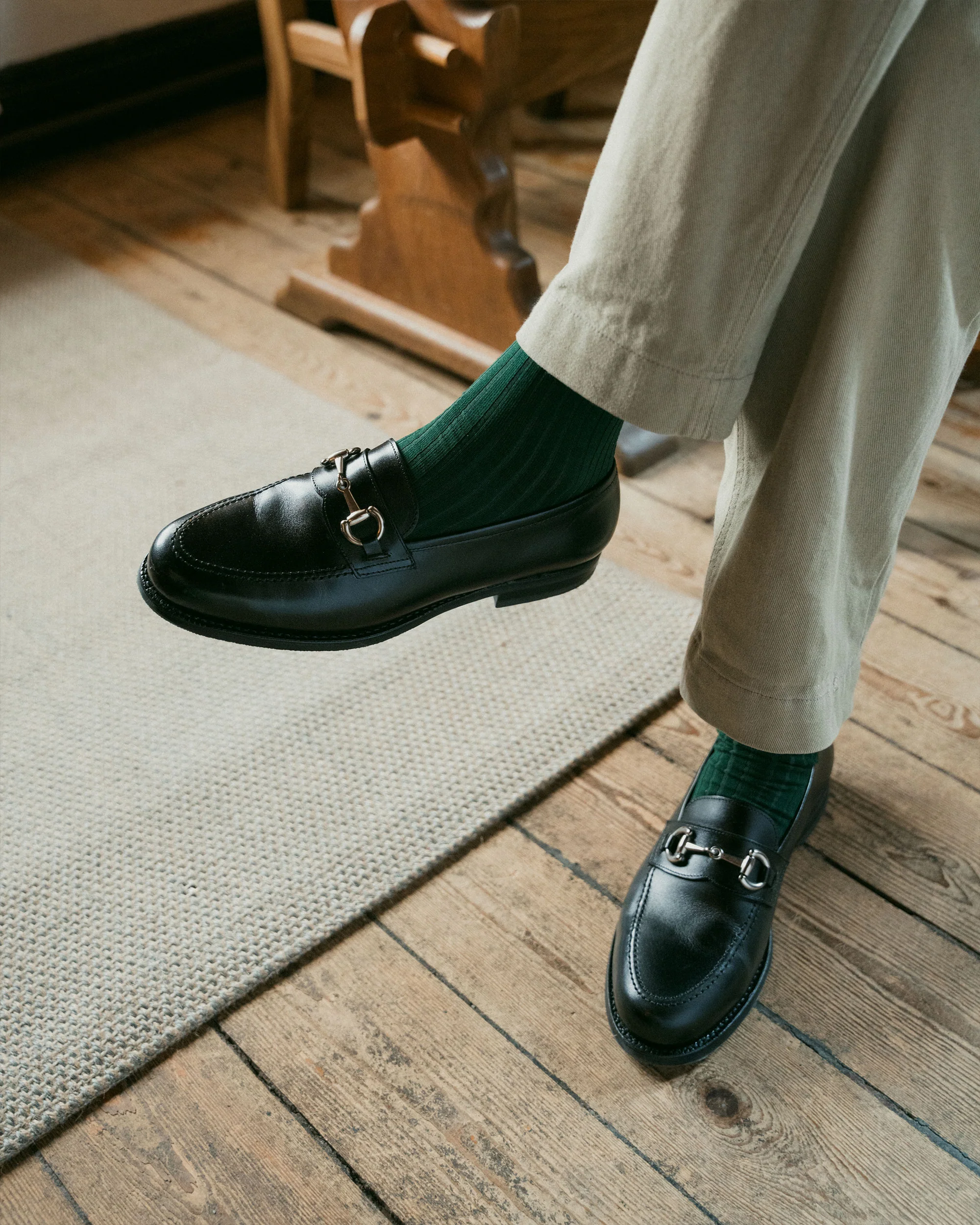Karlberg in black calf is a study in refined simplicity. The polished leather, shaped into a rounded toe and set on a bespoke rubber sole, delivers a silhouette that is both contemporary and enduring. A silver-toned horsebit detail adds a subtle accent, lending distinction without excess.