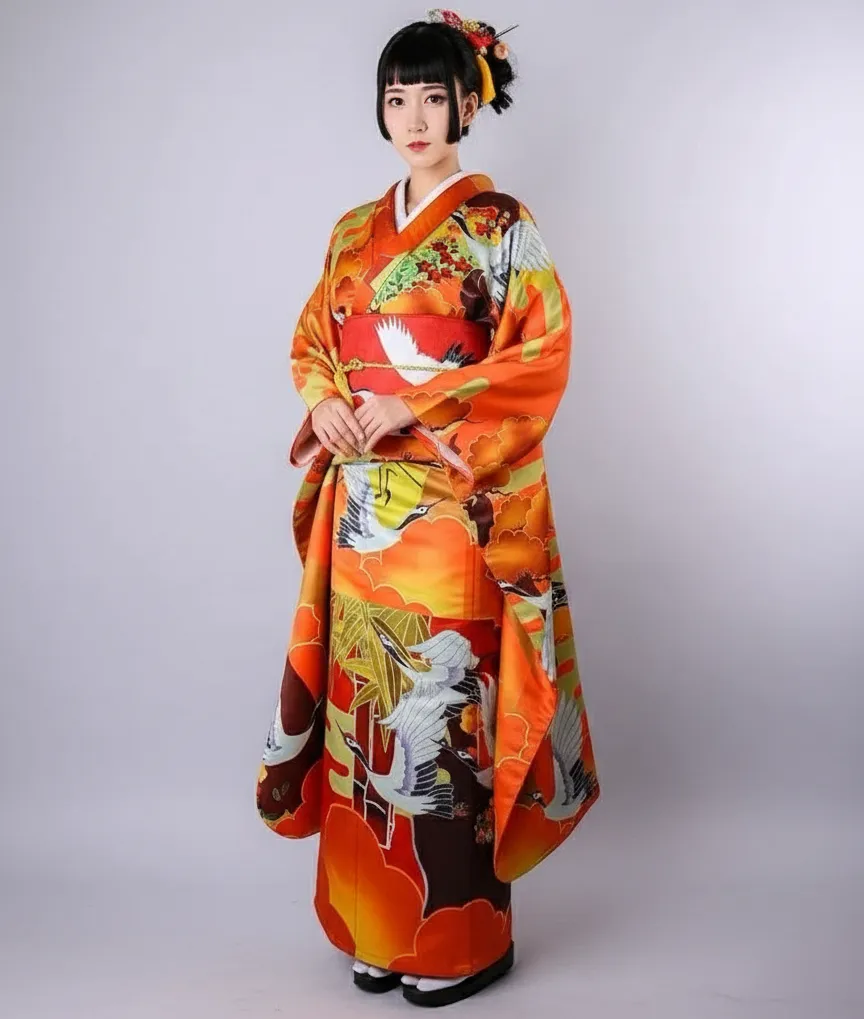 Ce Kimono Furisode orange est une véritable pièce de collection, conçu pour apporter une touche de tradition japonaise à vos événements et cérémonies. Sur un fond orange éclatant, de majestueuses grues blanches s’élèvent, symbolisant paix et prospérité. Les nuages flottants ajoutent une touche poétique, tandis que le dos est orné de détails floraux, créant un équilibre harmonieux entre élégance et vitalité.