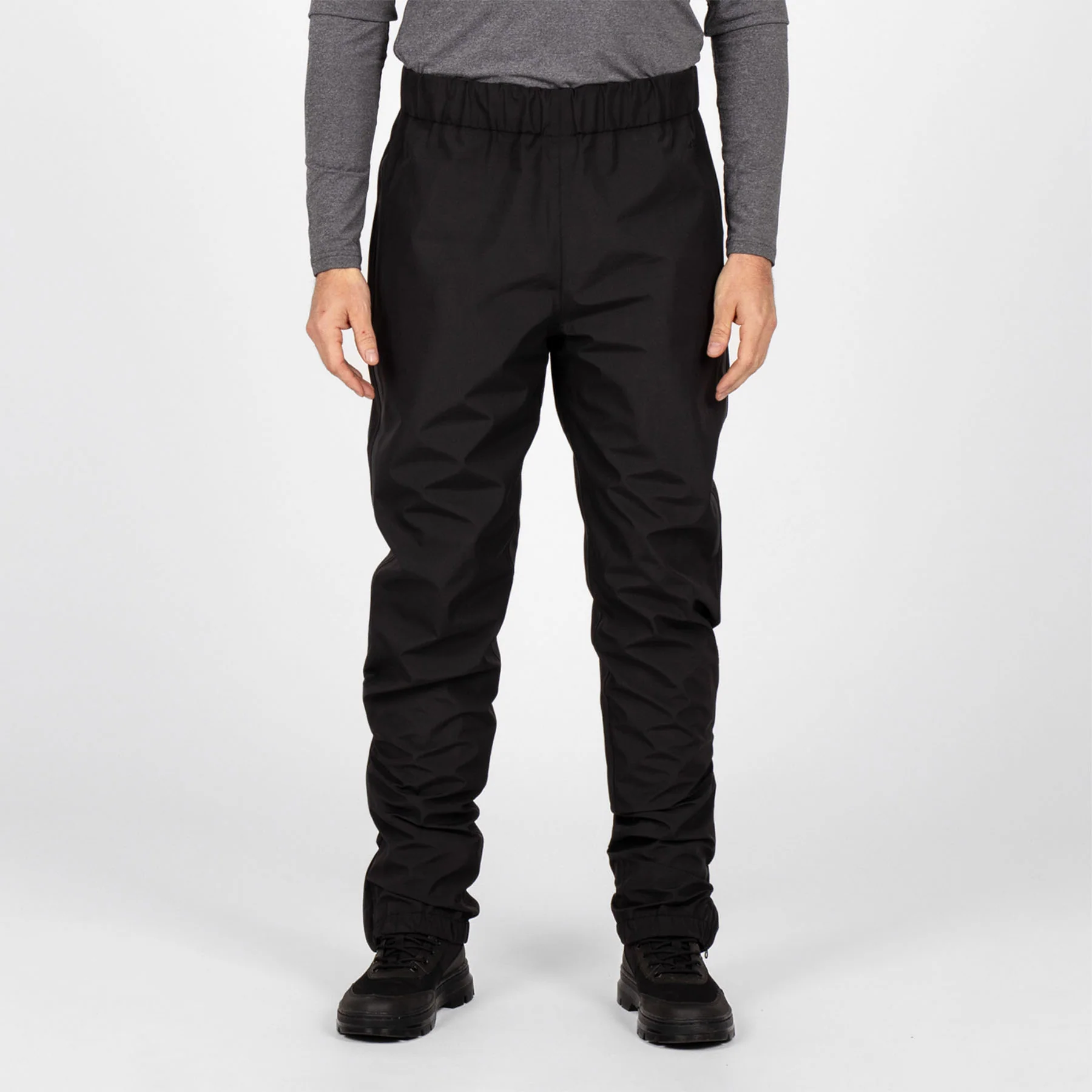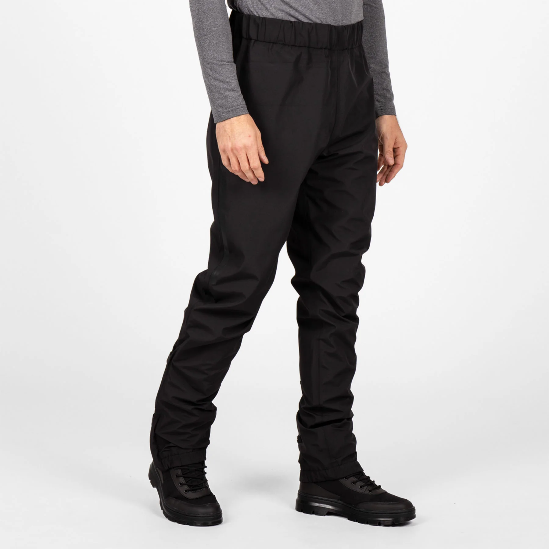 Schwarze, komplett wasserdichte Unisex-Regenhose von Knox. Dank der verschweißten Nähte und dem etwas höheren Bund mit Gummizug ist die Hose absolut wasserdicht, Reissverschlüsse an den Beinen erleichtern das An- und Ausziehen, zusätzlich kann die Weite am Bein durch Klettverschlüsse verstellt werden. Im mitgelieferten Beutel verstaut, benötigt die Jacke so gut wie keinen Stauraum.
