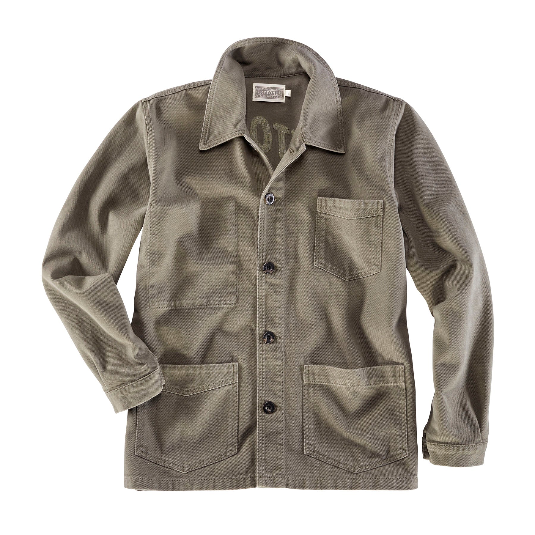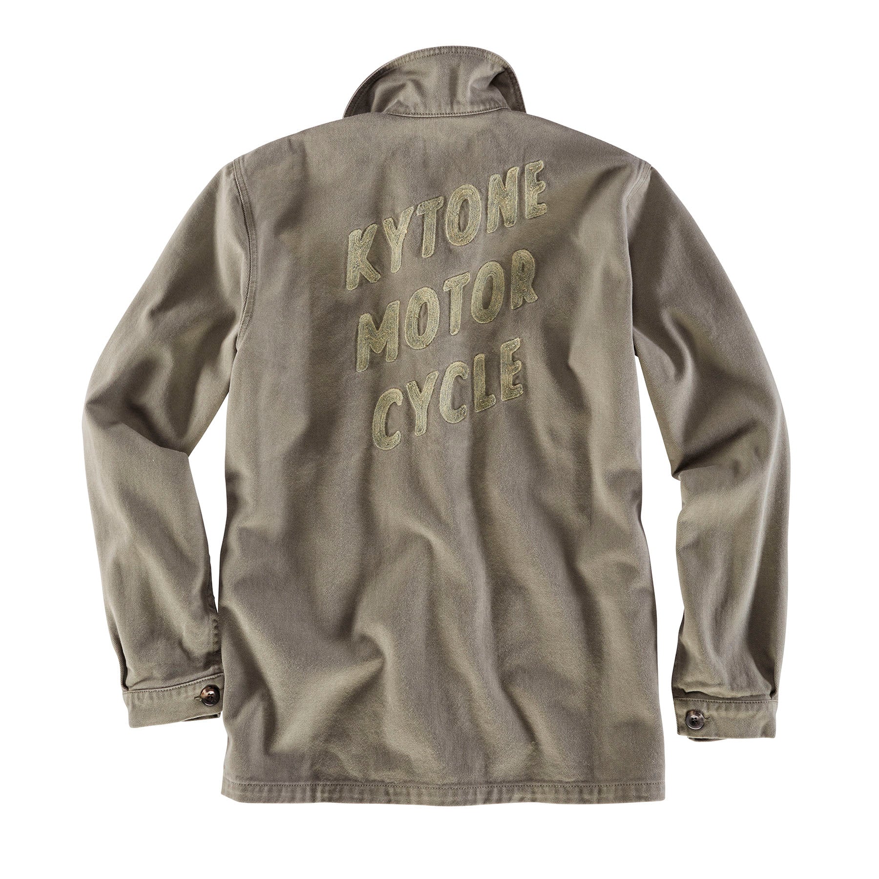 Ungefütterte Baumwolljacke im Workerstil von Kytone. Dieses Modell ist sehr nah am Original, angefangen von dem geraden Schnitt über die Manschetten mit kleinen Bewegungsfalten bis hin zum typischen Umlegekragen. Auch die Taschen sind in diesem Stil, jede ist ein wenig anders genäht, die rechte Brusttasche wurde sogar zur Innentasche umfunktioniert. Das absolute Highlight ist jedoch der Kytone Schriftzug am Rückenteil, der sehr aufwendig aufgestickt ist, jedoch durch die Farbwahl nicht zu plakativ wirkt.