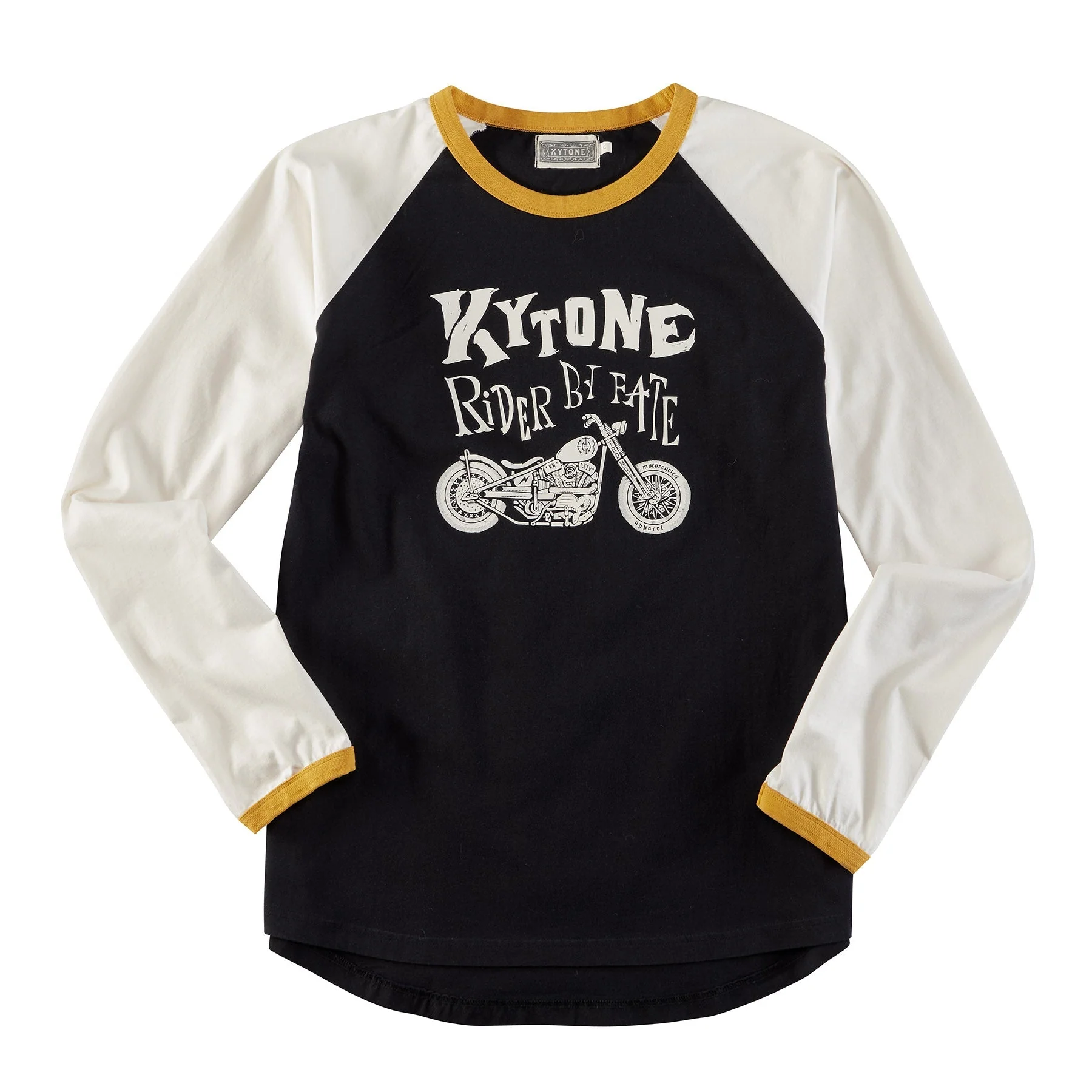 Langarmshirt im Baseballstil von Kytone. Die Farbkombination von Schwarz/Weiss wird durch den Raglanschnitt gut betont, die senffarbenen Bündchen am Hals und den Ärmeln bilden eine weitere sehr stimmige Kombi. Der Print am Vorderteil zeigt ein Motorrad und das Credo von Kytone.