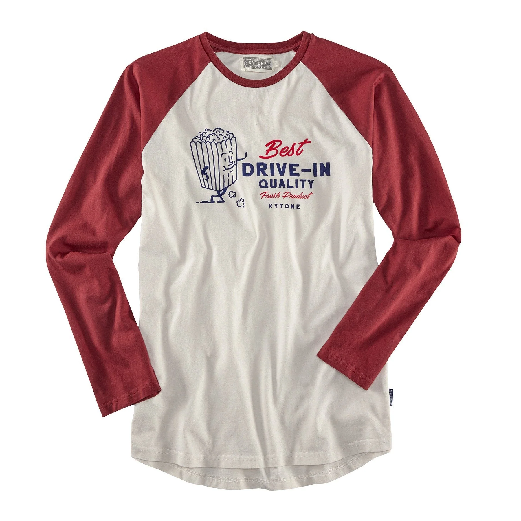 Longsleeve im Raglanschnitt von Kytone. Die schöne Farbmischung von Beige und Dunkelrot wird durch den Print am Vorderteil gut unterstrichen. Das Motiv erinnert an eine Werbung für ein amerikanisches Diner oder Autokino. Das Rückenteil ist etwas länger und leicht gerundet geschnitten, die Ärmel enden gerade.