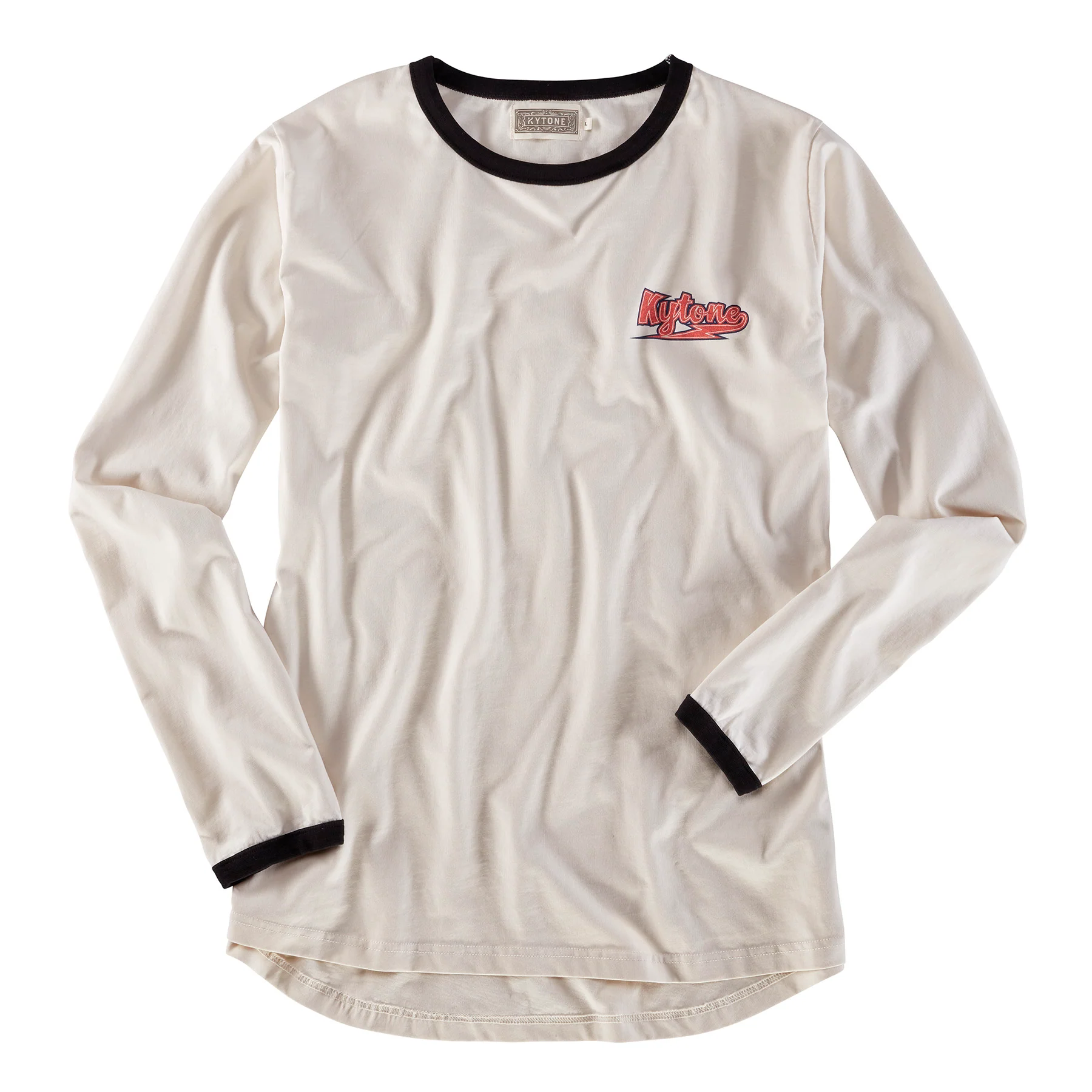 Longsleeve in Offwhite von Kytone. Sehr schlicht und klassisch sind es die kleinen Details, die dieses Shirt besonders machen. Da sind die schwarz eingefassten Ärmel und der Halsausschnitt, aber auch der LogoPrint an der linken Brust, der durch den leichten Used Look eine sehr lässige Optik erzeugt. Für den perfekten Tragekomfort ist das Rückenteil etwas länger und leicht gerundet geschnitten.