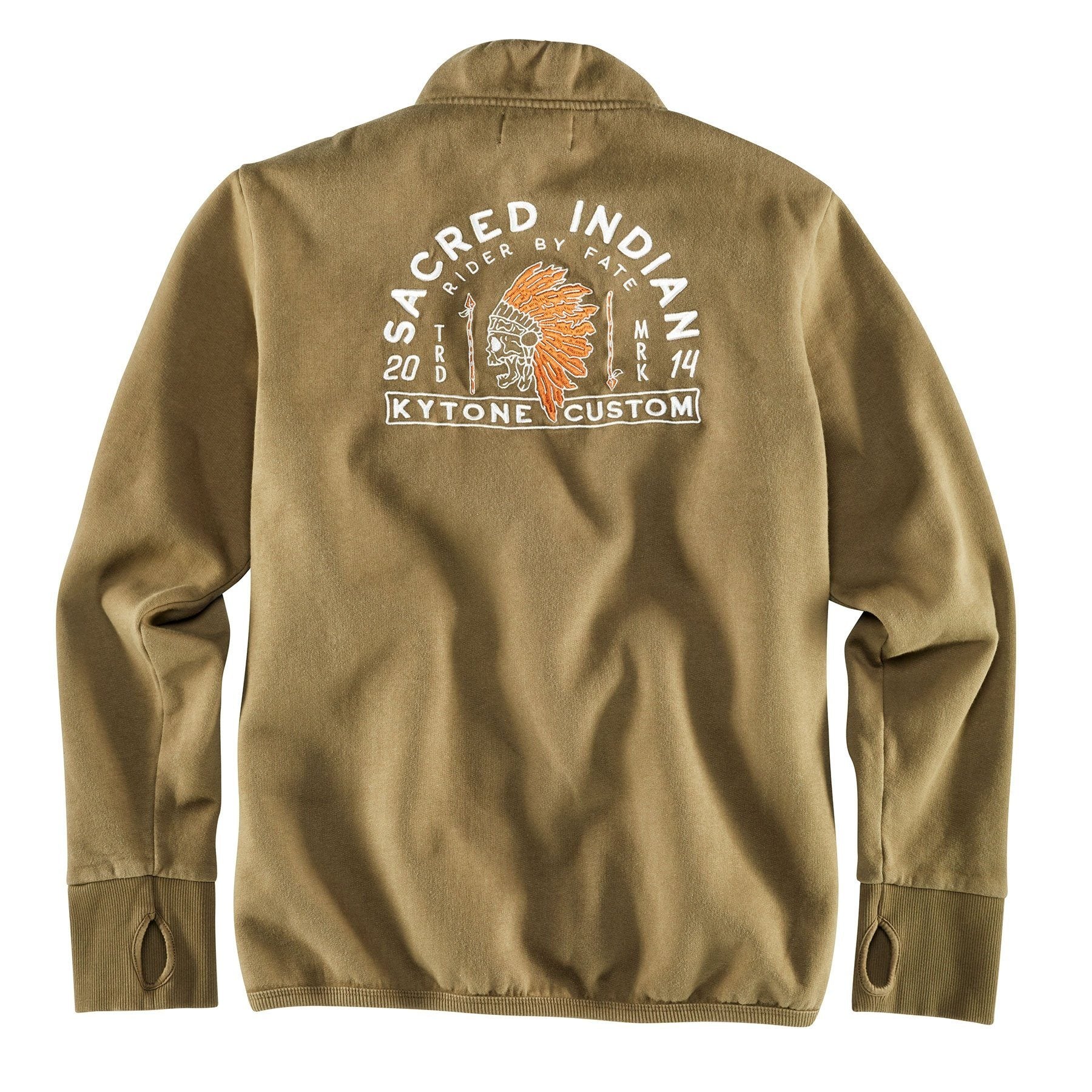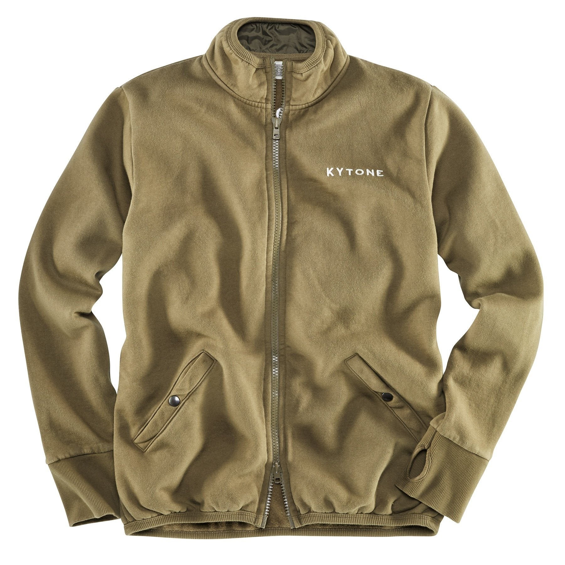 Olivgrüne Sweatjacke von Kytone. Klassisch im Schnitt sorgen hier mehrere Komponenten für möglichst großen Windschutz: Die Abschlüsse an Bund und Kragen sind sehr schmal und etwas enger gearbeitet, die Ärmelbündchen etwas breiter geschnitten und mit Daumenschlaufen ausgestattet, um möglichst perfekten Sitz zu garantieren und lästigen Wind abzuhalten. Auch die konische Kragenlösung verhindert störenden Durchzug. Ganz besonders aber hält das Extrafutter aus Polyester am Vorderteil z. B. Fahrtwind ab. An der linken Brust ist eher dezent der Kytone Schriftzug aufgestickt, den Rücken ziert ein mehrfarbiger Indianerskull sowie diverse Schriftzüge, ebenfalls alles aufgestickt.