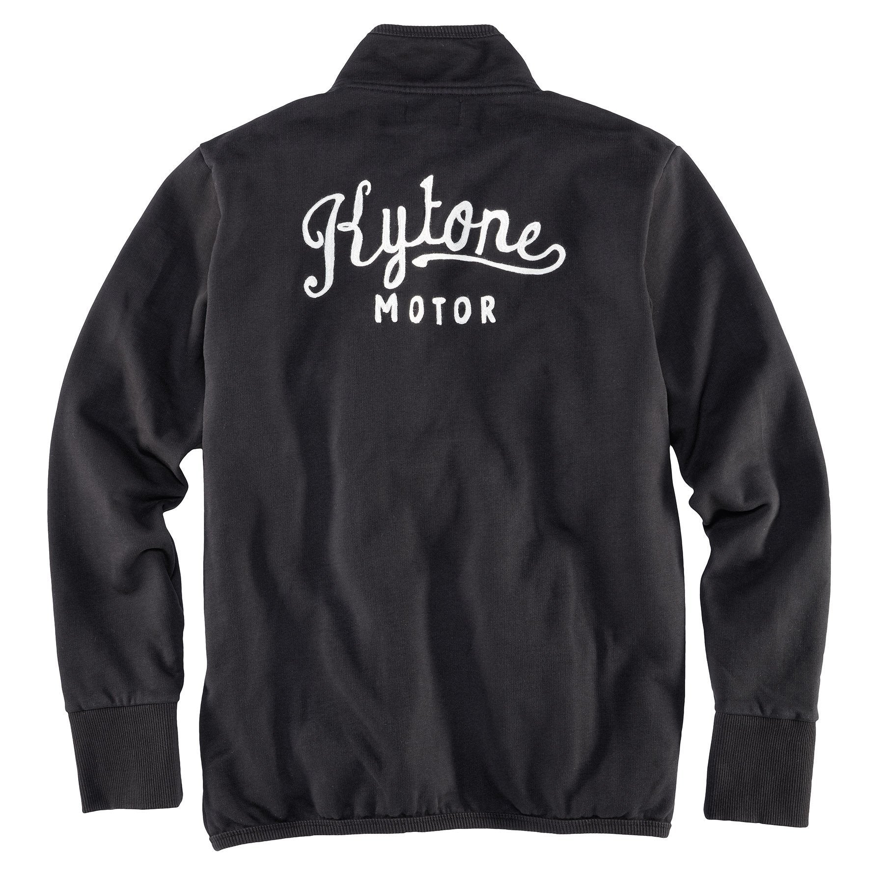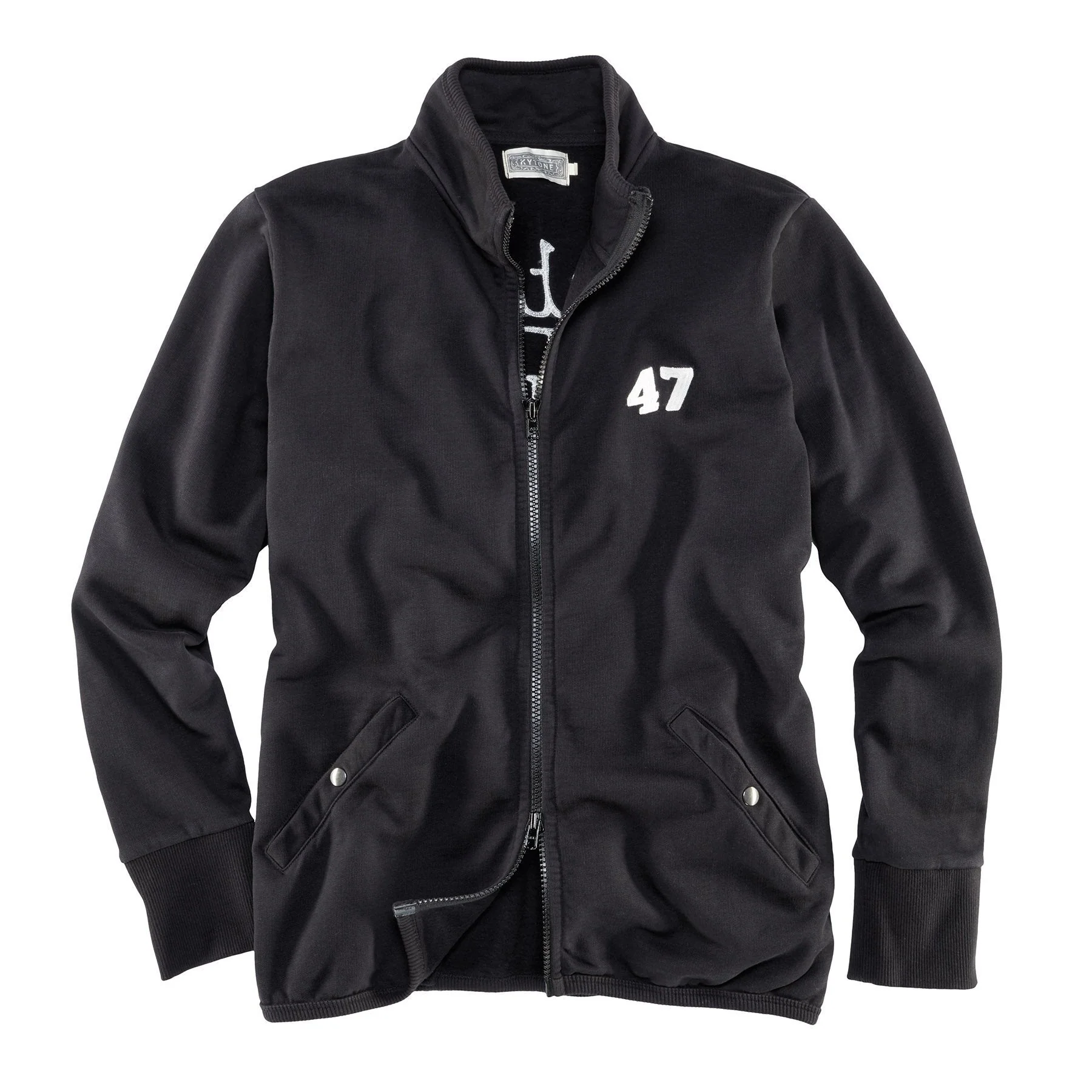 Sweatjacke in Schwarz von Kytone. Eigentlich klassisch geschnitten wird diese Jacke durch die besondere Bündchenlösung an Kragen und Bund speziell. Durch diese Verarbeitung schließt die Jacke oben und unten besser ab, sodass weniger Wind durchpfeifen kann. die Ärmelbündchen wiederum sind etwas breiter, um auch hier den Wind besser abzuhalten. Am Rücken ist groß der Kytone Schriftzug aufgestickt, am Vorderteil ist lediglich in klein die « 47 » gestickt. Der Kragen ist außerdem leicht konisch gearbeitet, auch das hält zusätzlich warm.