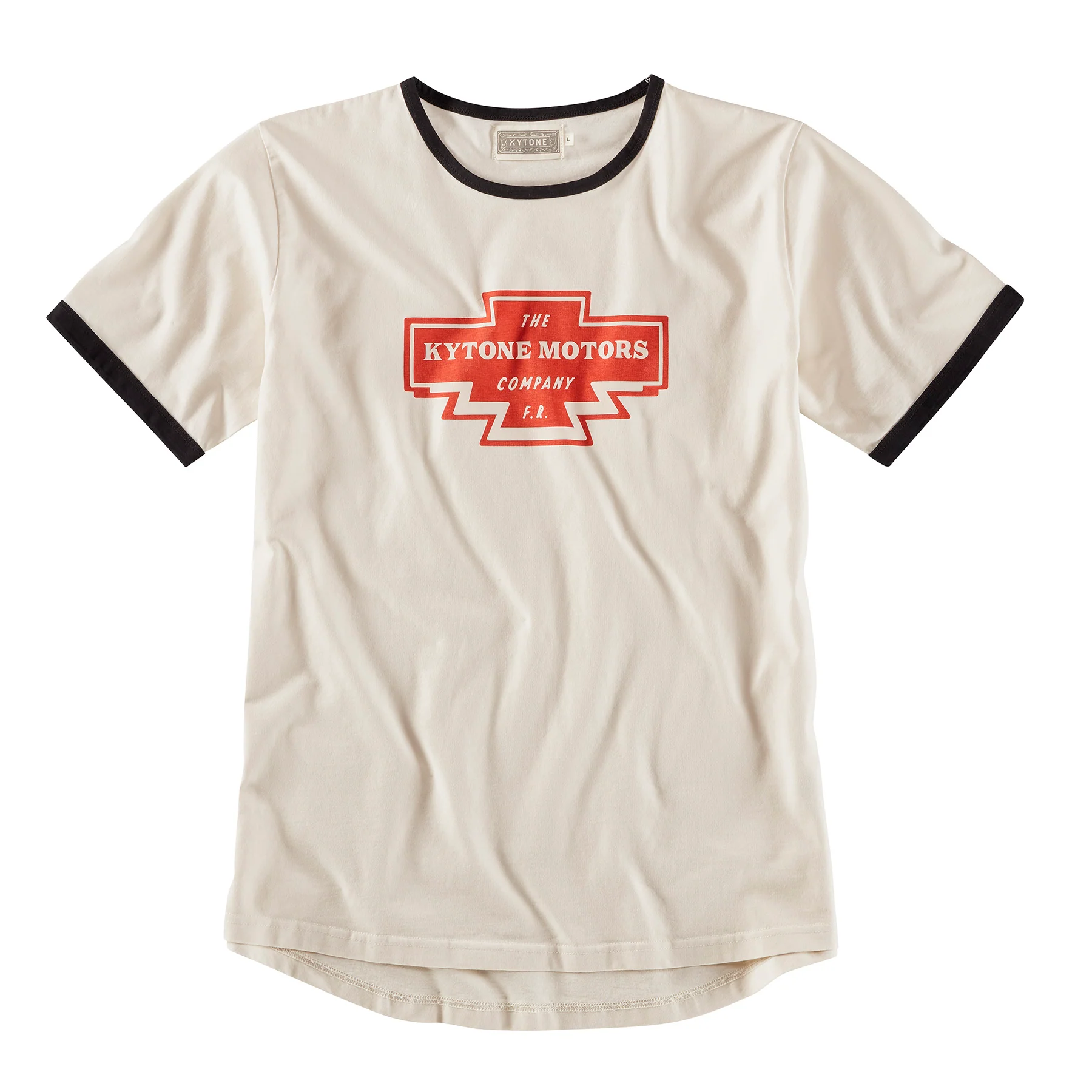 T-Shirt in hellem Beige von Kytone. Nicht nur der relativ große Schriftzug Print am Vorderteil verleiht eine lässige Optik, richtig cool wird der Look erst durch den schwarz eingefassten Halsausschnitt und Ärmel. Im Rücken etwas länger geschnitten.