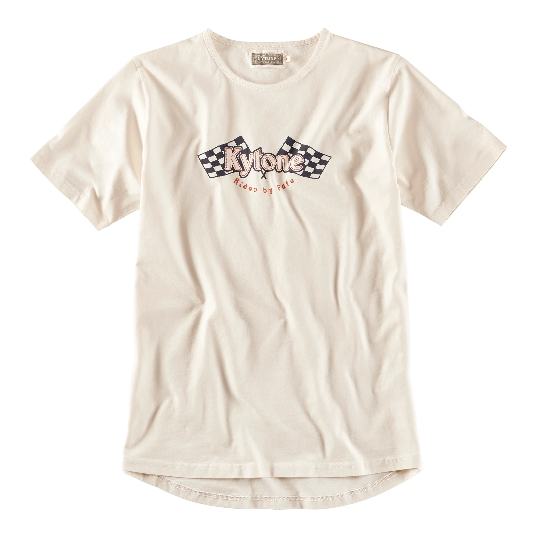 Herrenshirt aus etwas festerer Baumwolle von Kytone. Der Print am Vorderteil zeigt zwei Zielflaggen sowie den Kytone Schriftzug und das Credo des Labels. Das Rückenteil ist für mehr Tragekomfort am Bike ein wenig länger und leicht gerundet geschnitten.